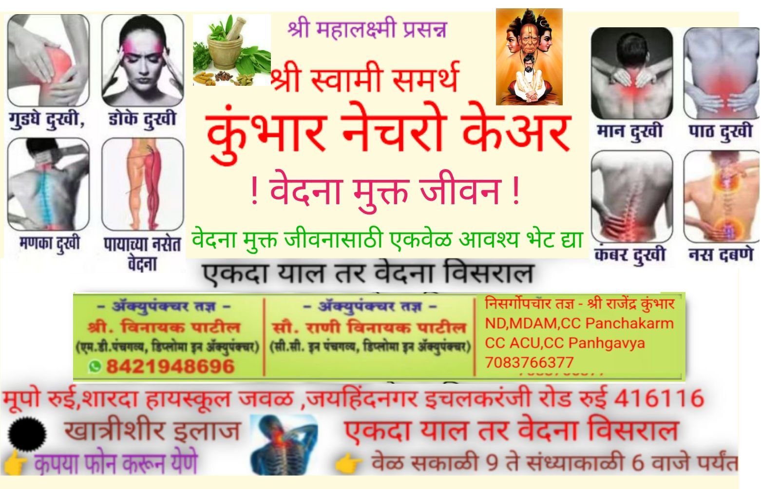 🙏 श्री स्वामी समर्थ 🙏 कमर दर्द, पीठ दर्द, घुटनोका दर्द, मनकोंका दर्द,तणाव, मोटापा,लकवा, डायबेटिस,किडनी स्टोन, मूळव्याध, इन समस्यायोंके लिये एकबार आवश्य संपर्क करे..* राजेंद्र कुंभार 7083766377,9518916043