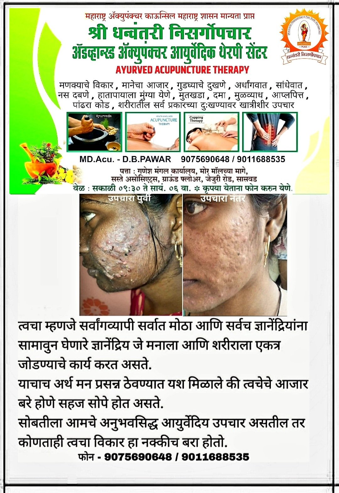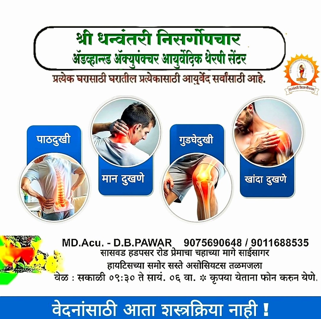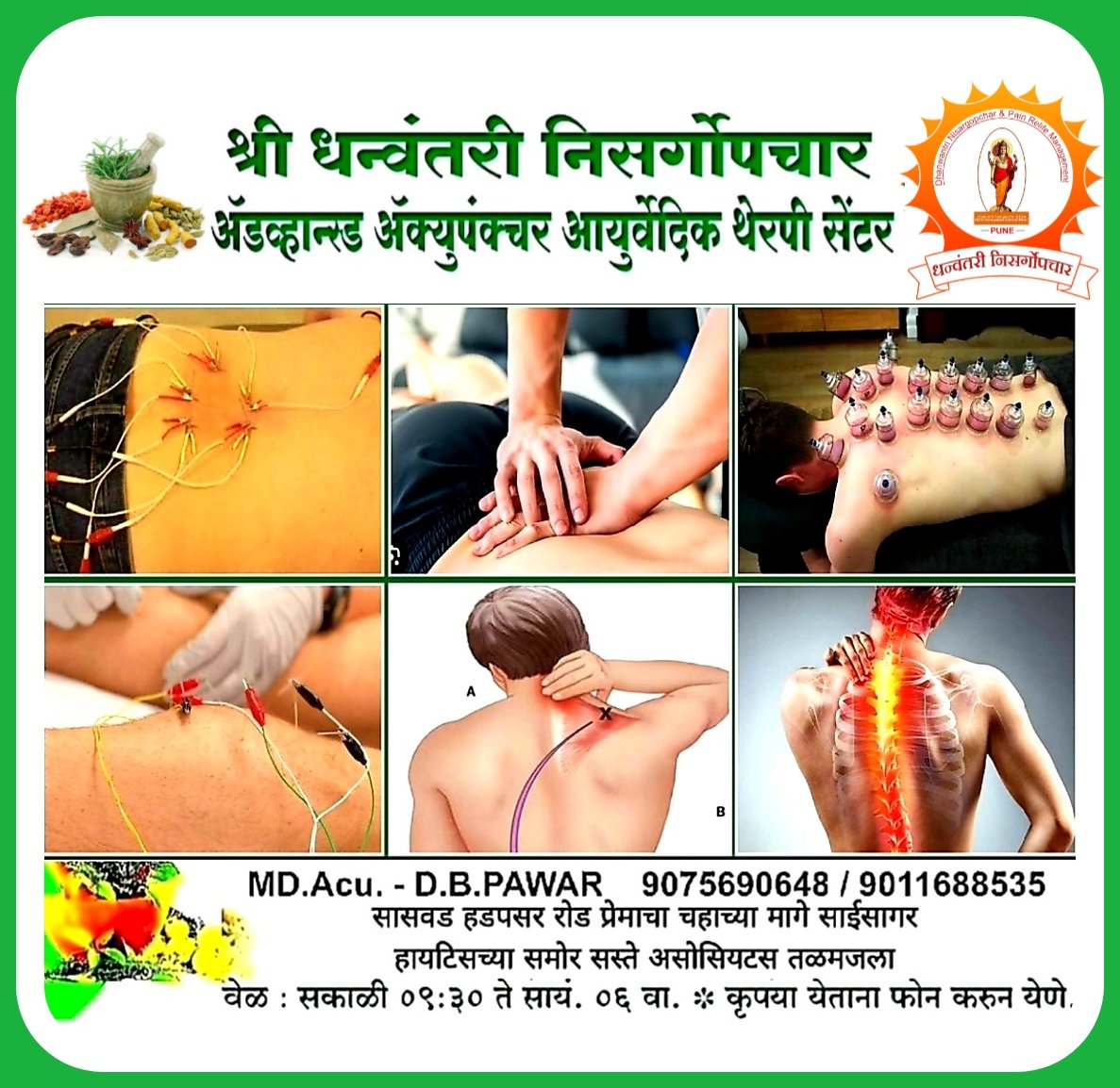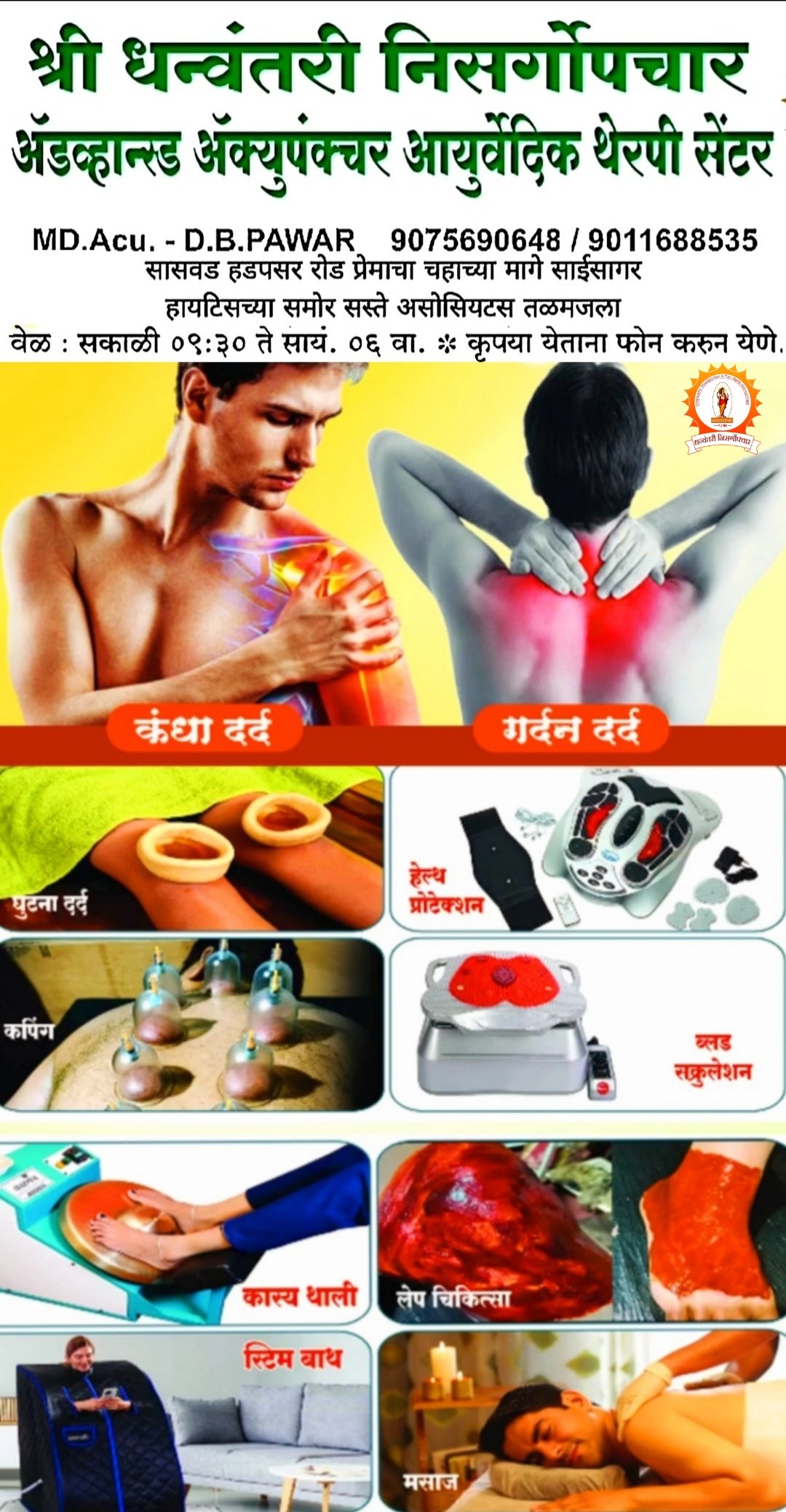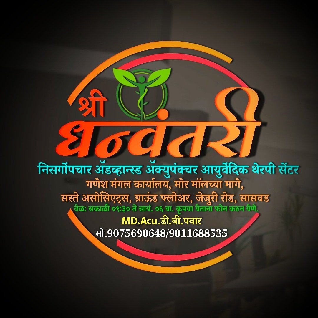 श्री धन्वंतरी निसर्गोपचार ॲडव्हान्स्ड ॲक्युपंक्चर आयुर्वेदिक थेरपी सेंटर ,डॉ. डी बी पवार Md.acu.dnys. गणेश मंगल कार्यालय,मोर मॉल च्या मागे, सासवड