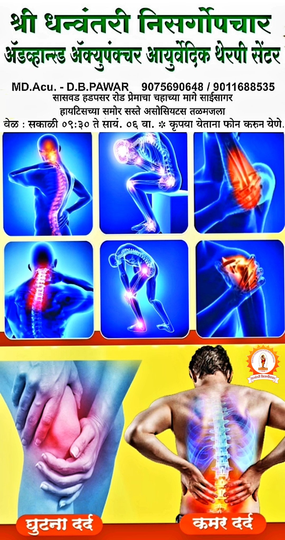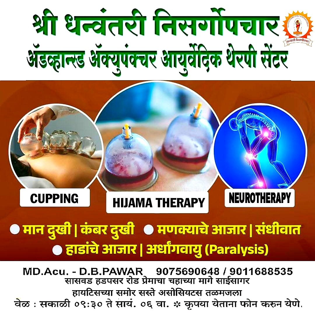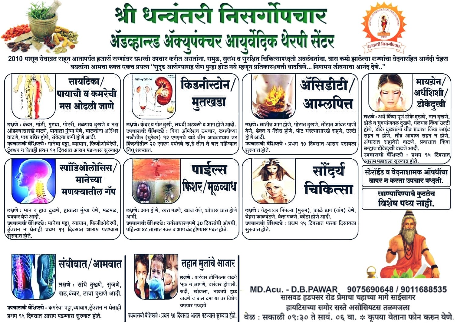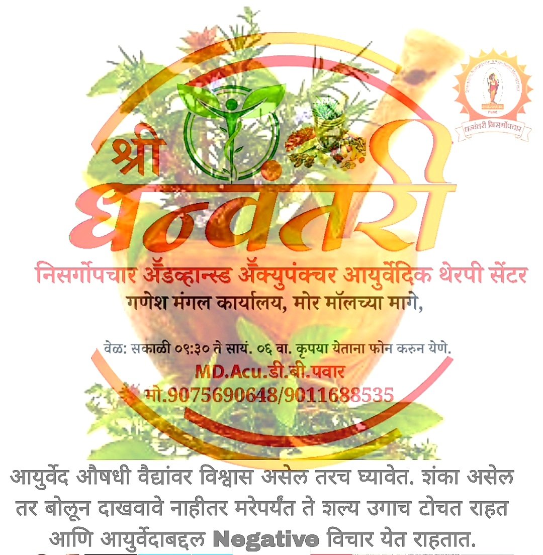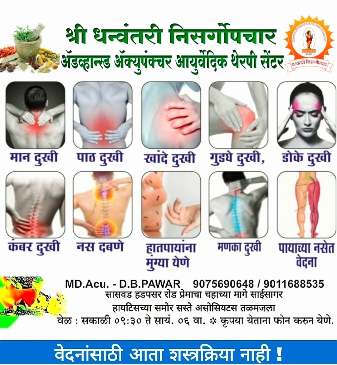 श्री धन्वंतरी निसर्गोपचार ॲडव्हान्स्ड ॲक्युपंक्चर आयुर्वेदिक थेरपी सेंटर ,डॉ. डी बी पवार Md.acu.dnys. गणेश मंगल कार्यालय,मोर मॉल च्या मागे, सासवड