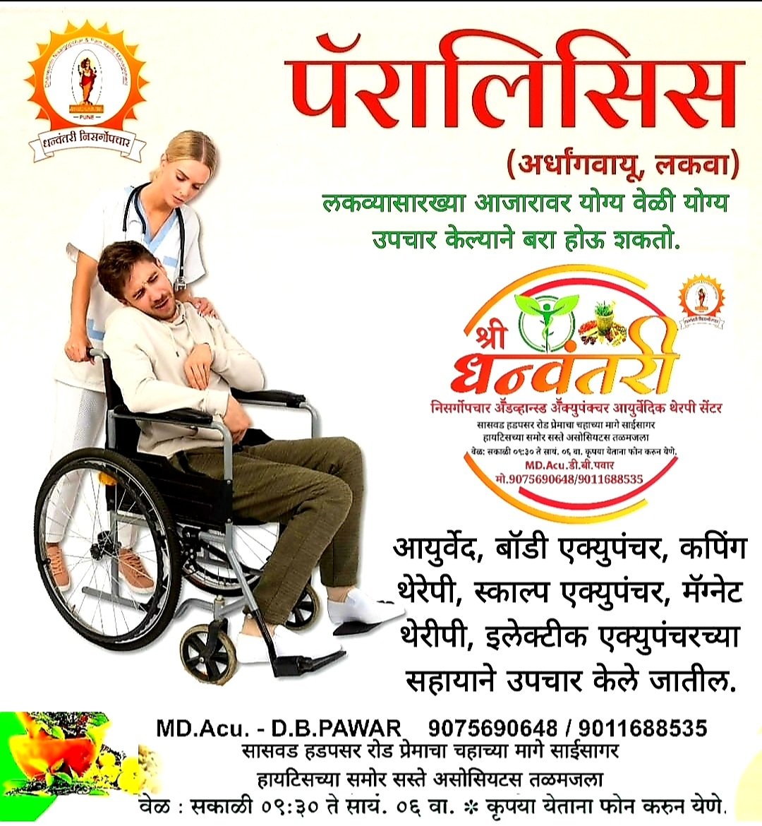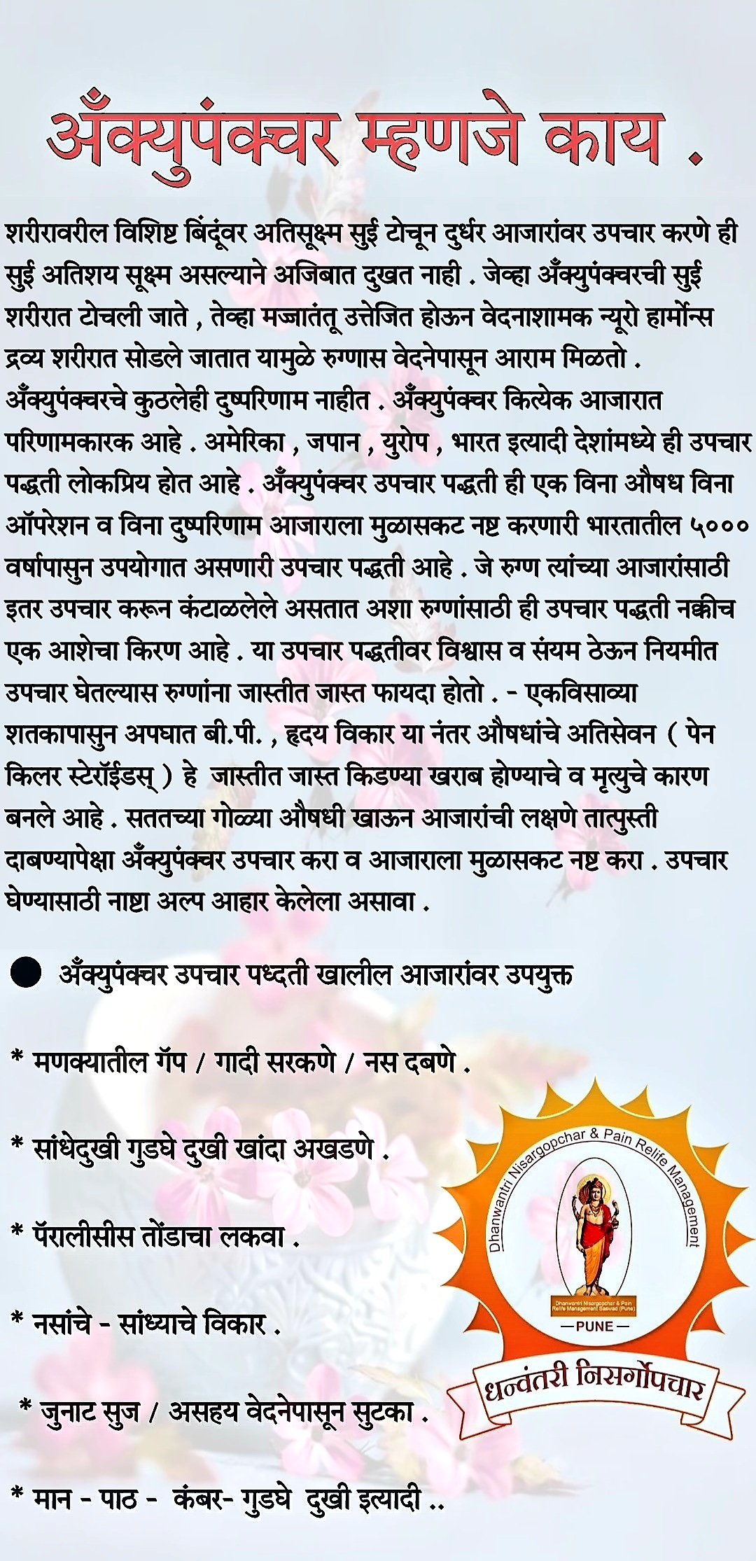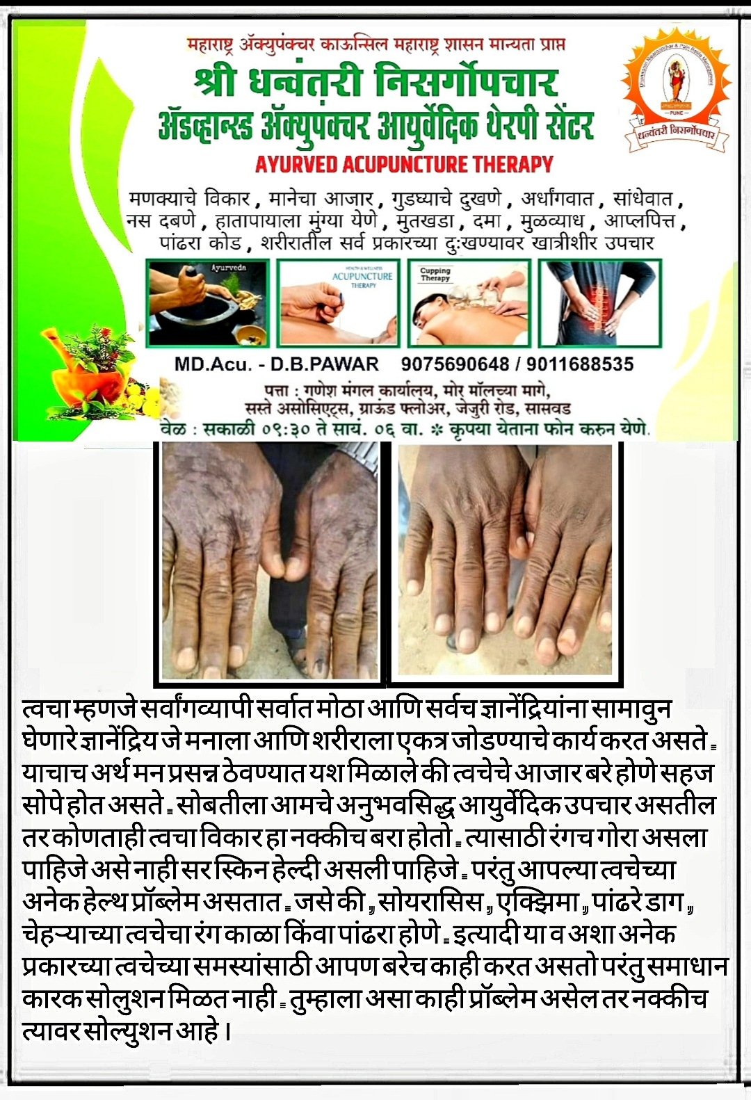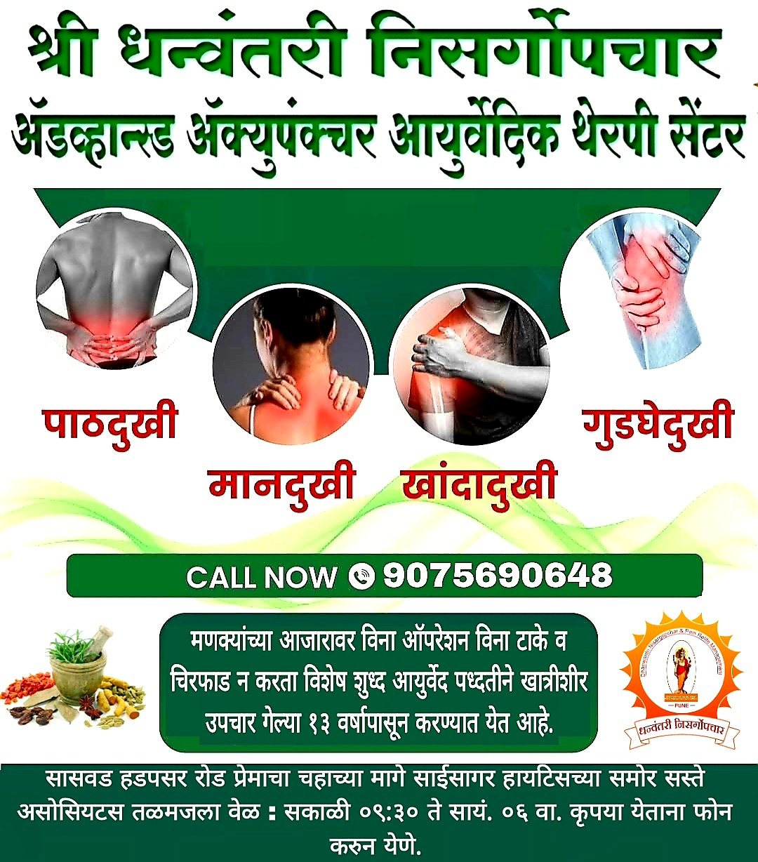 श्री धन्वंतरी निसर्गोपचार ॲडव्हान्स्ड ॲक्युपंक्चर आयुर्वेदिक थेरपी सेंटर ,डॉ. डी बी पवार Md.acu.dnys. गणेश मंगल कार्यालय,मोर मॉल च्या मागे, सासवड