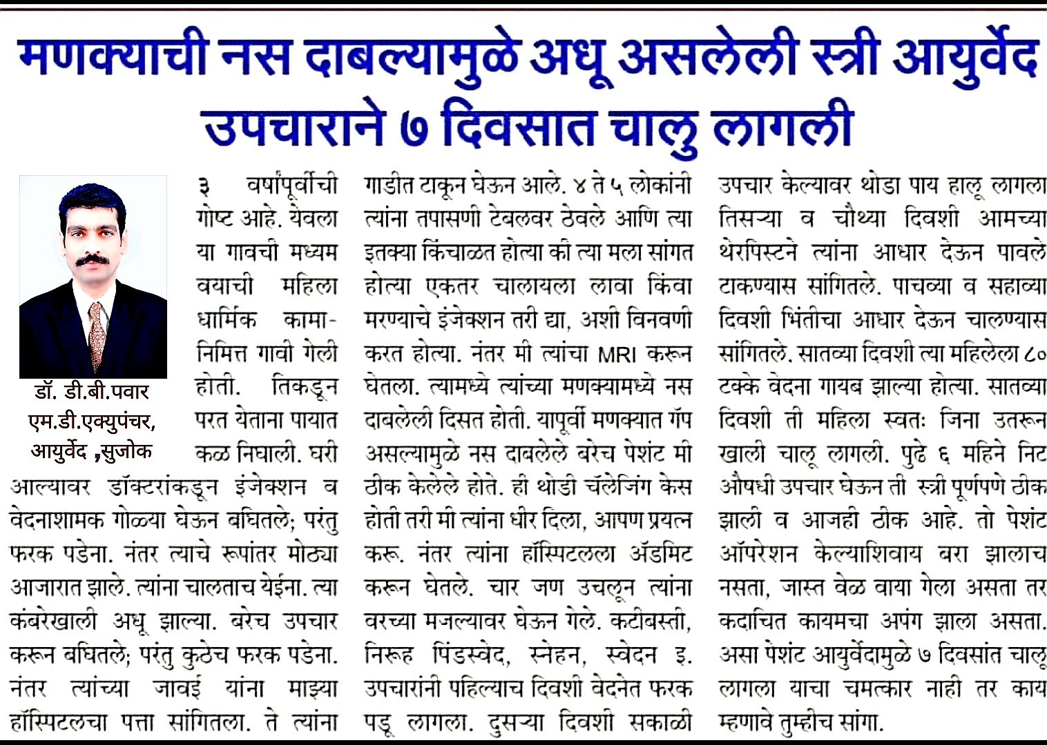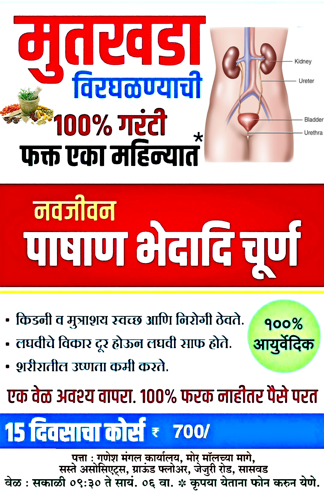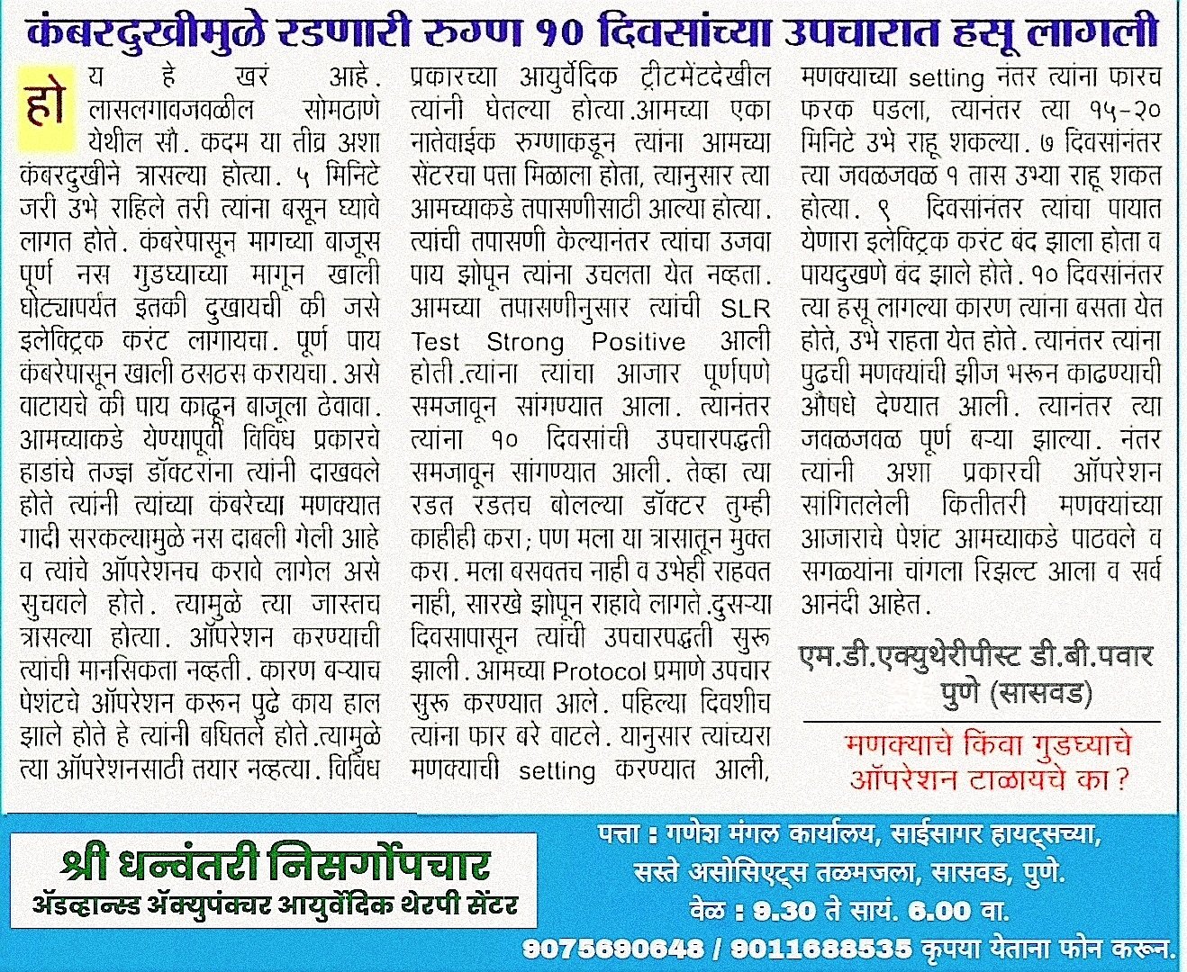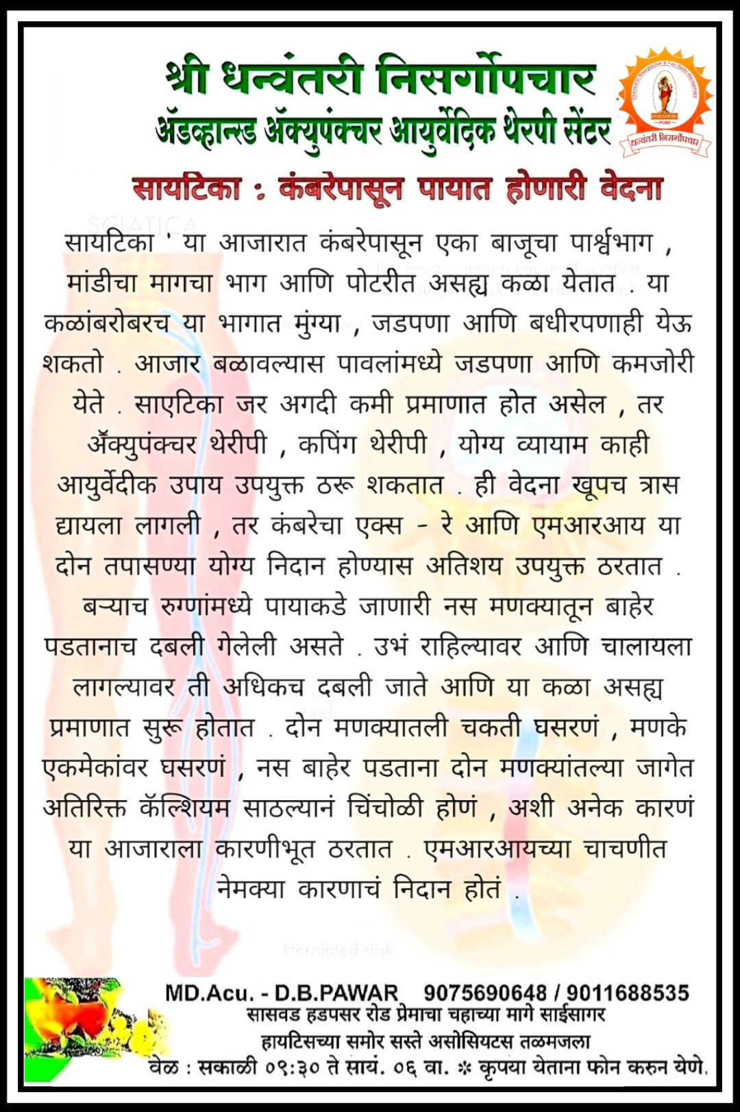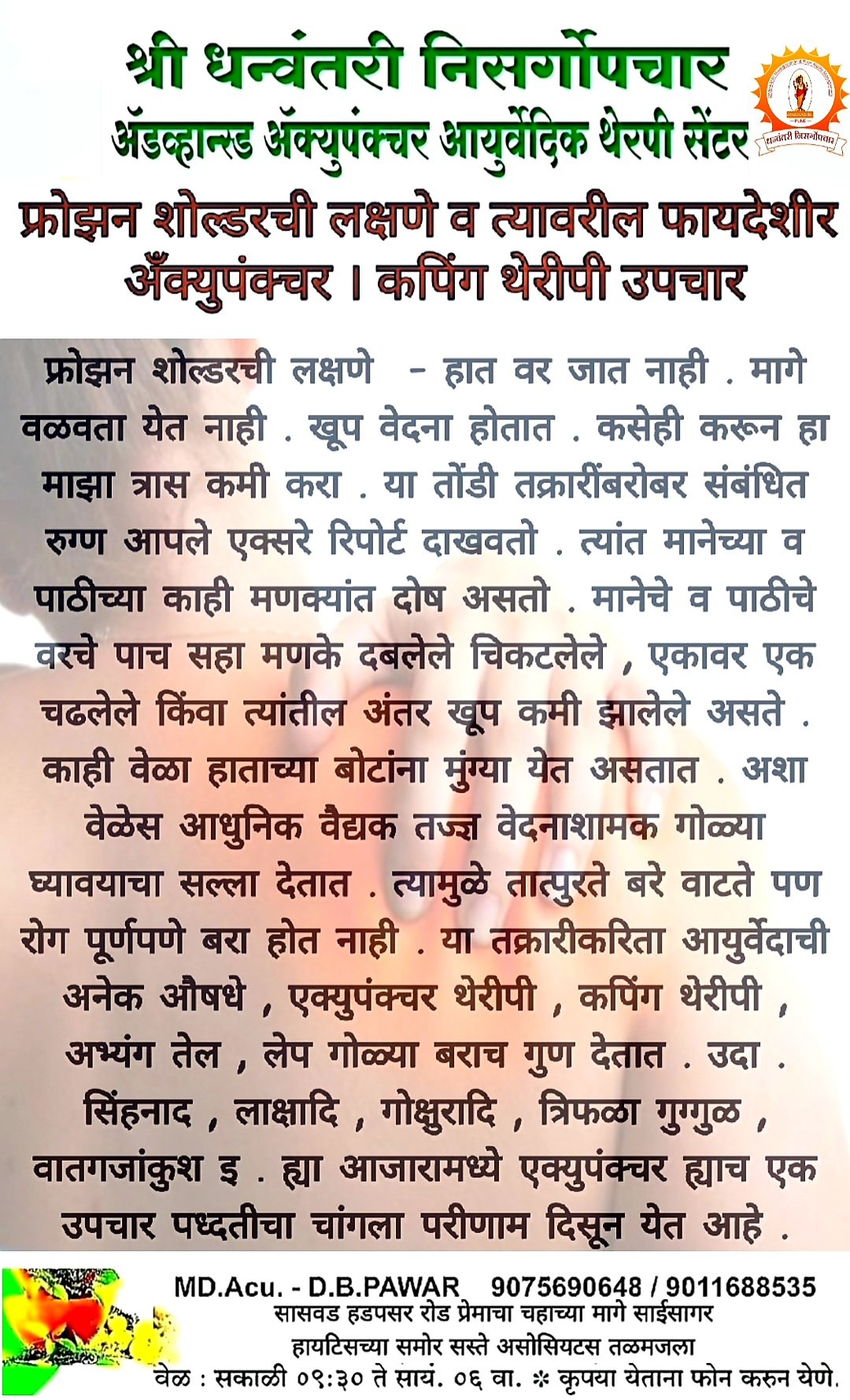 श्री धन्वंतरी निसर्गोपचार ॲडव्हान्स्ड ॲक्युपंक्चर आयुर्वेदिक थेरपी सेंटर ,डॉ. डी बी पवार Md.acu.dnys. गणेश मंगल कार्यालय,मोर मॉल च्या मागे, सासवड