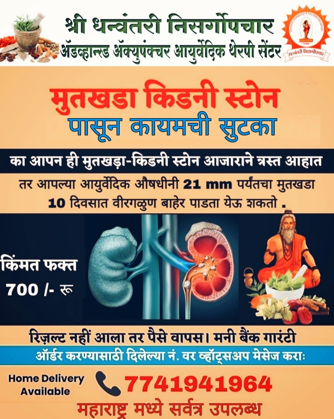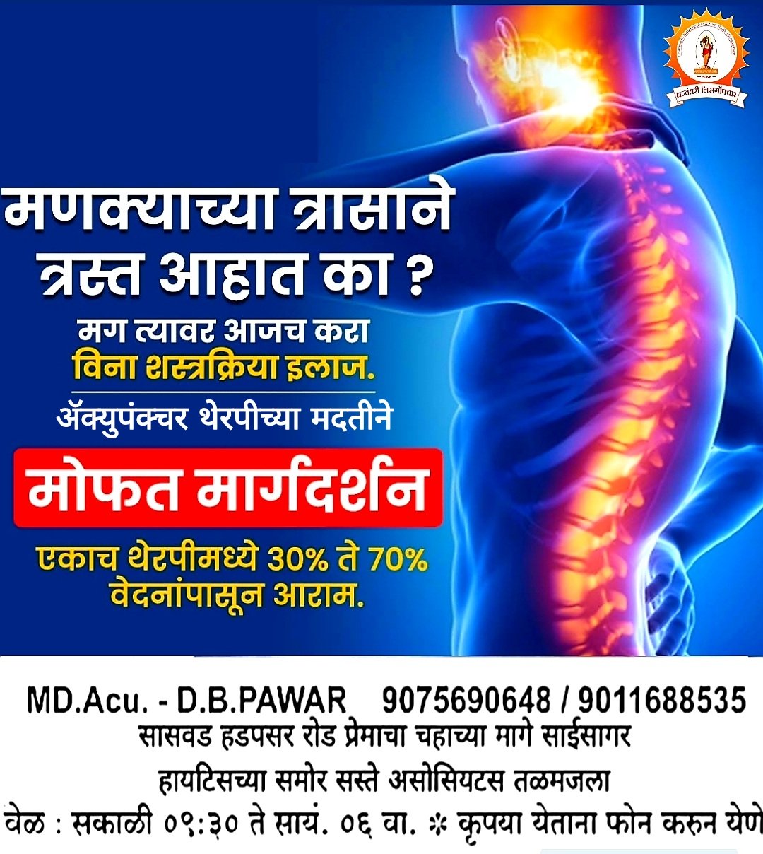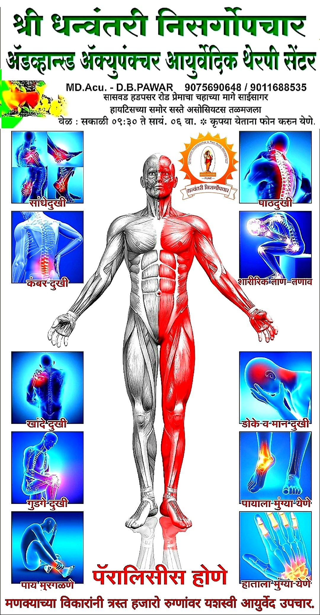 विनम्र आणि तत्पर सेवा. सीड्स थेरपी मॅग्नेट थेरपी स्टोन थेरपी आयुर्वेदिक ॲक्युपंक्चर थेरपी मणक्याचे विकार मानेचा आजार गुडघ्याचे दुखणे अर्धांगवात सांधेवात नस दबणे हातापायाला मुंग्या येणे मुतखडा दमा मुळव्याध आम्लपित्त पांढरा कोड शरीरातील सर्व प्रकारच्या दुखण्यावर खात्रीशीर उपाय असंख्य समाधानी रुग्ण शास्त्रशुद्ध पद्धतीने पंचकर्म ब्लड प्रेशर मधुमेह पाठ दुखी कंबर दुखी अल्सर मान दुखी सांधेदुखी गुडघेदुखी तसेच इतर शारीरिक व्याधींवर खास आयुर्वेदिक पद्धतीने उपचार एक वेळ अवश्य भेट द्या व संपर्क साधा .🙏 धन्यवाद