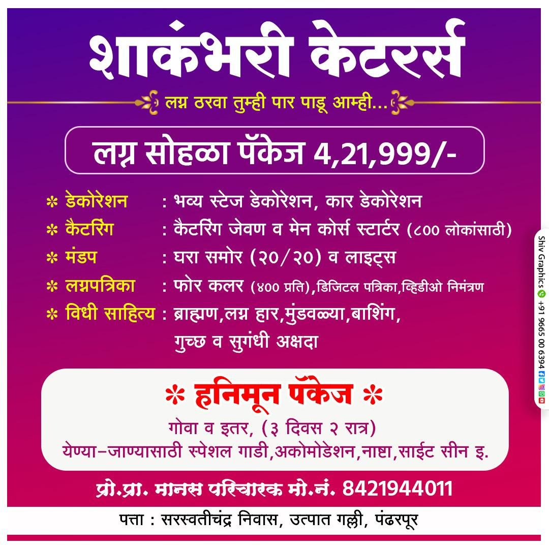 शाकंभरी केटरर्स प्रो.प्रा : मानस परिचारक मो.नं : 8421944011 पत्ता : सरस्वतीचंद्र निवास, उत्पात गल्ली, पंढरपूर.