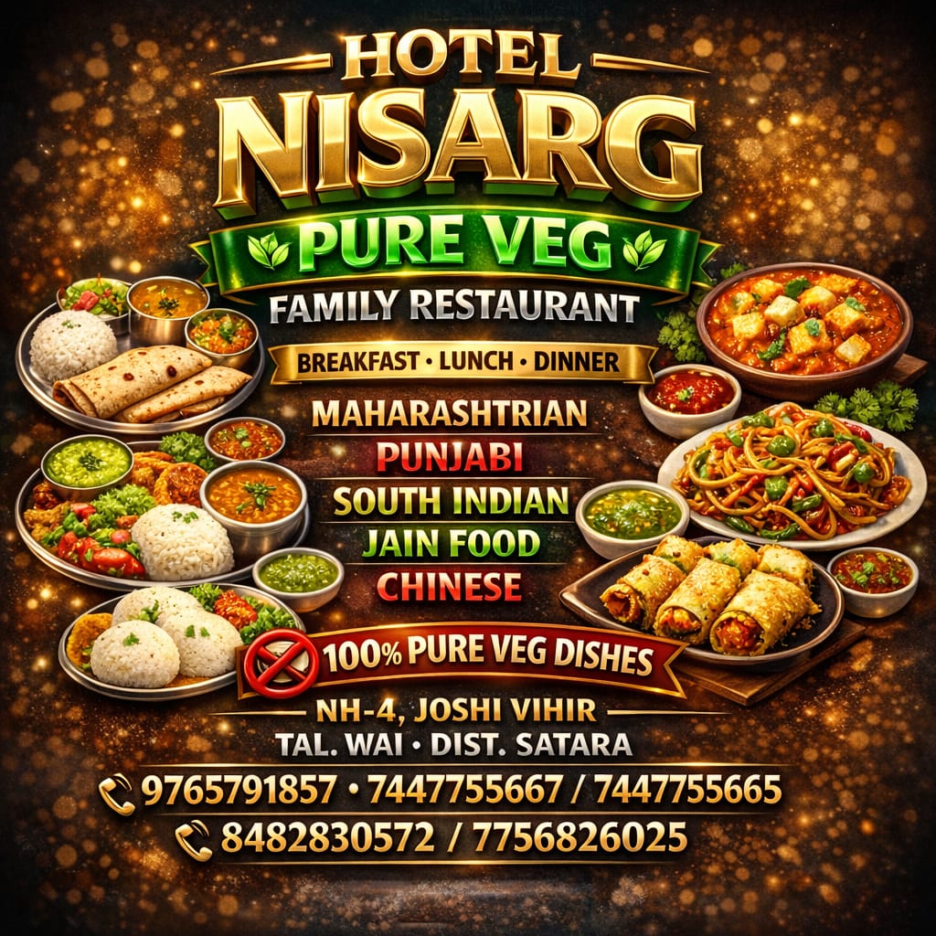 ЁЯеШ HOTEL NISARG,PURE VEG, FAMILY RESTAURANT. BREAKFAST, LUNCH, DINNER, MAHARASHTRIAN, PUNJABI,SOUTH INDIAN ,JAIN, CHINESE,NH 4, JOSHI VIHIR, TAL. WAI, DIST. SATARA. ЁЯУ▓ 9765791857, ЁЯУ▓ 7447755667, ЁЯУ▓ 7447755665, ЁЯУ▓ 8482830572, ЁЯУ▓ 7756826025