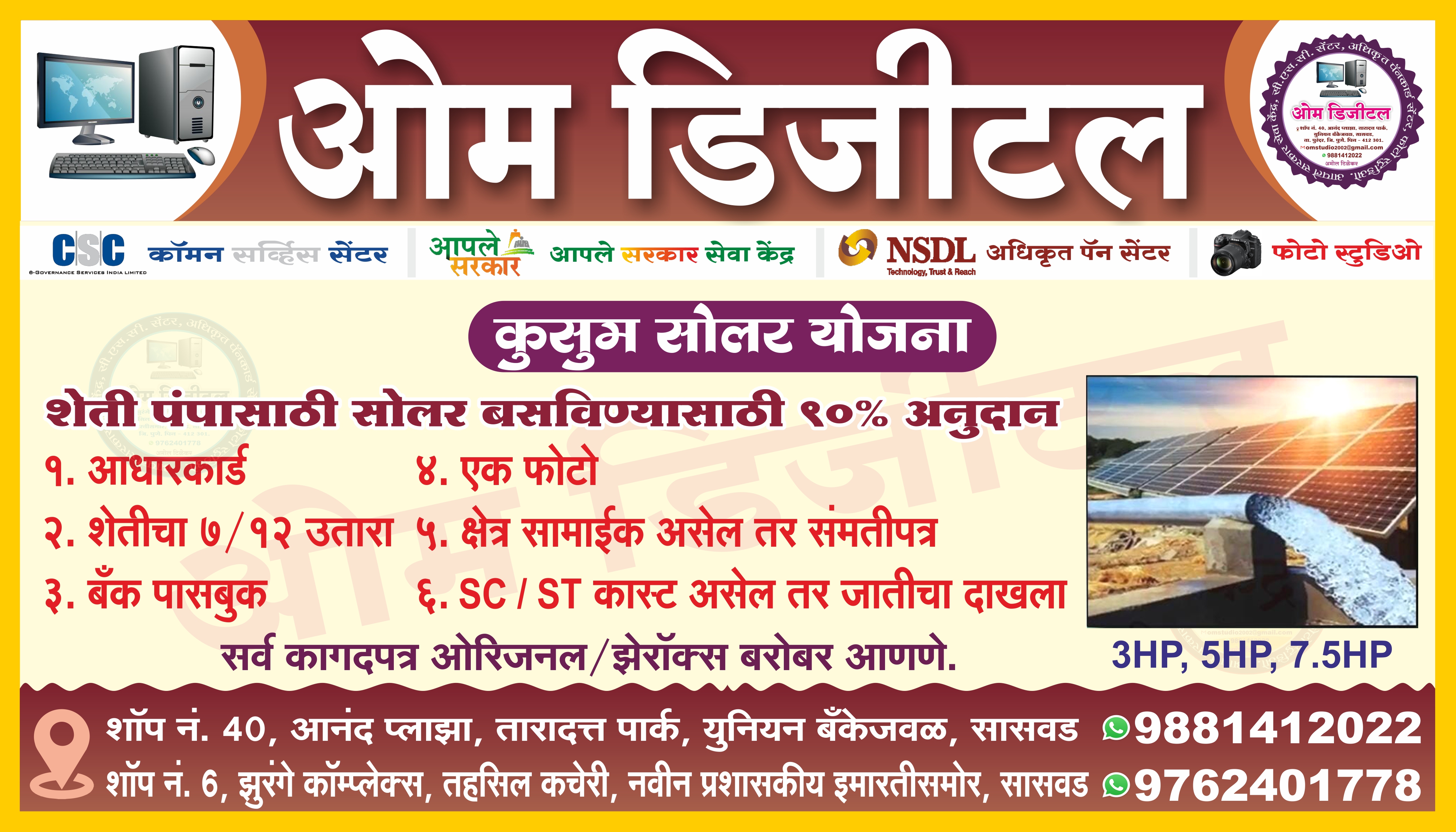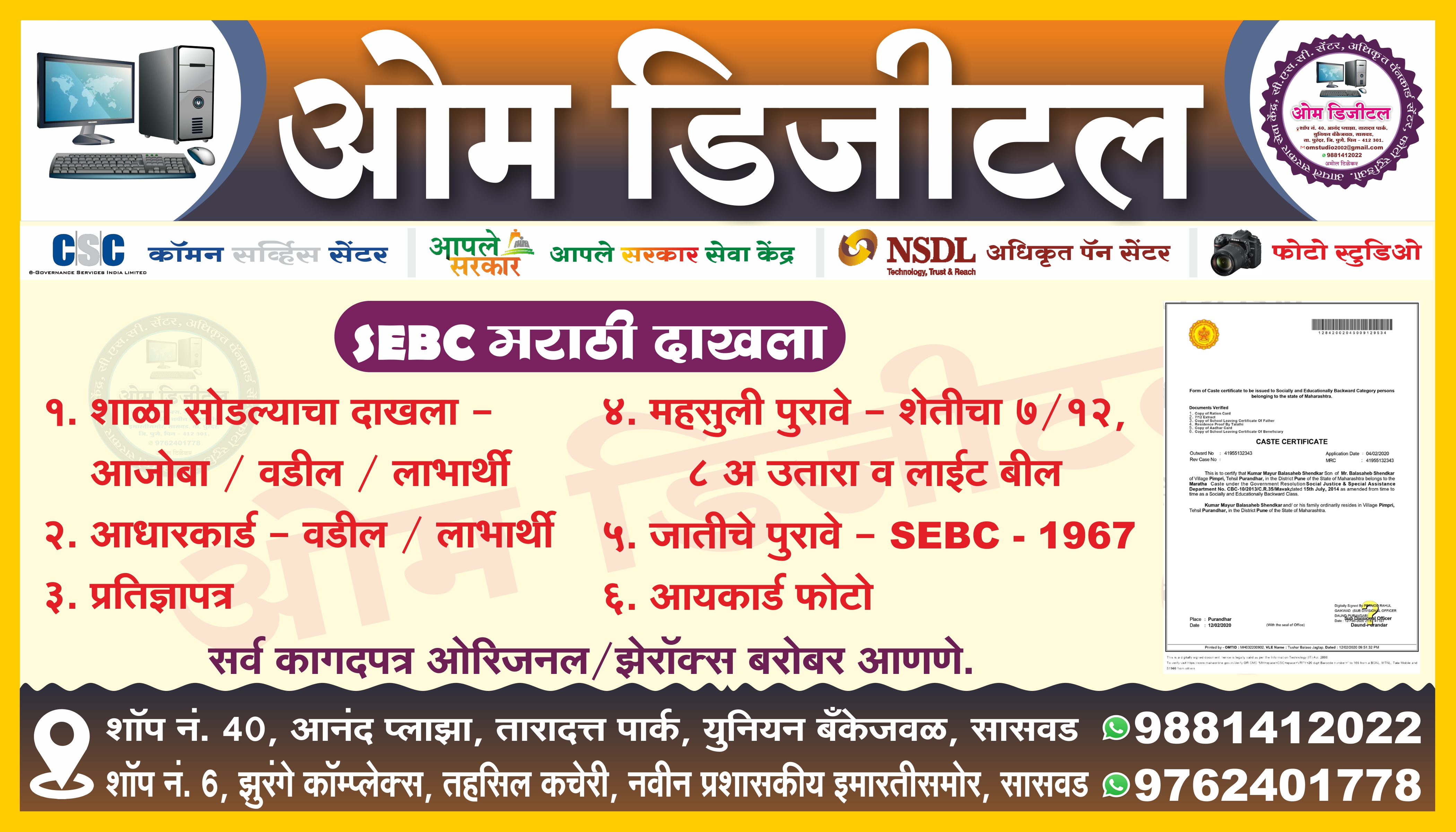 📲 9881412022 📲 9156814032 💻ओम डिजीटल सासवड , ✳️पॅनकार्ड सेंटर, ✳️ शॉप ॲक्ट ✳️ उद्योग आधार , ✳️ उत्पन्न दाखला ✳️ डोमासाईल ✳️ नॉन क्रिमीलेयर ✳️ फूड लायसन्स ✳️ गॅझेट