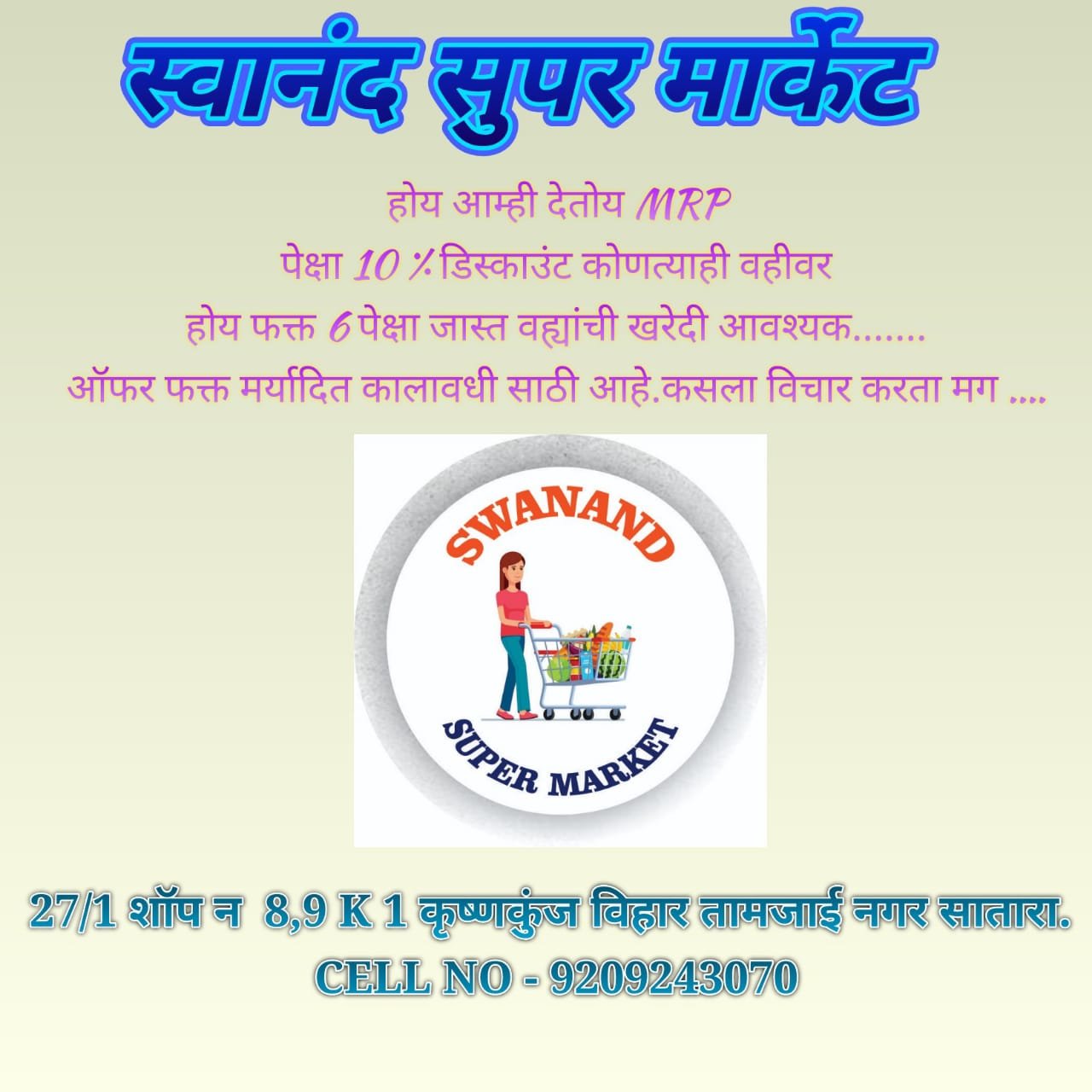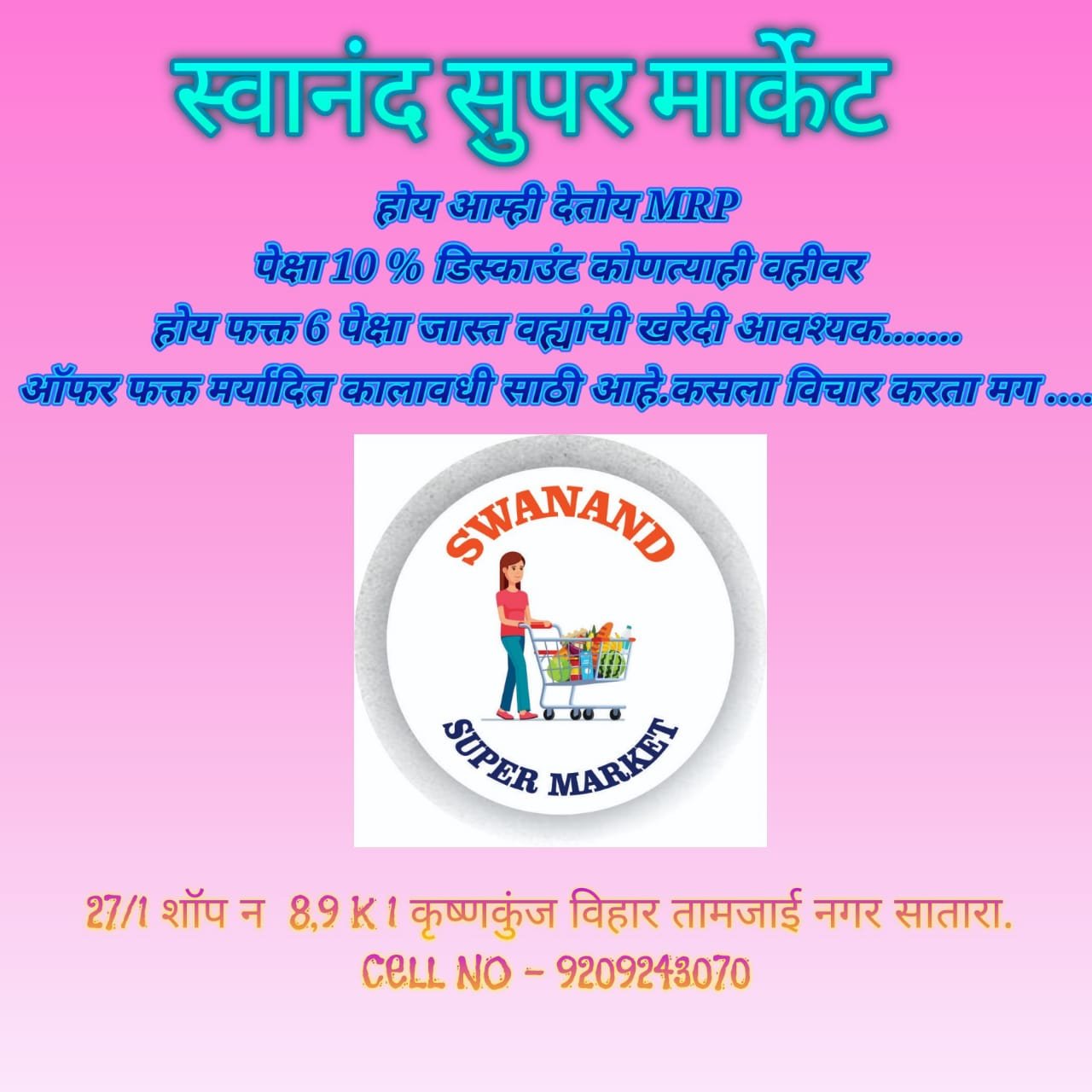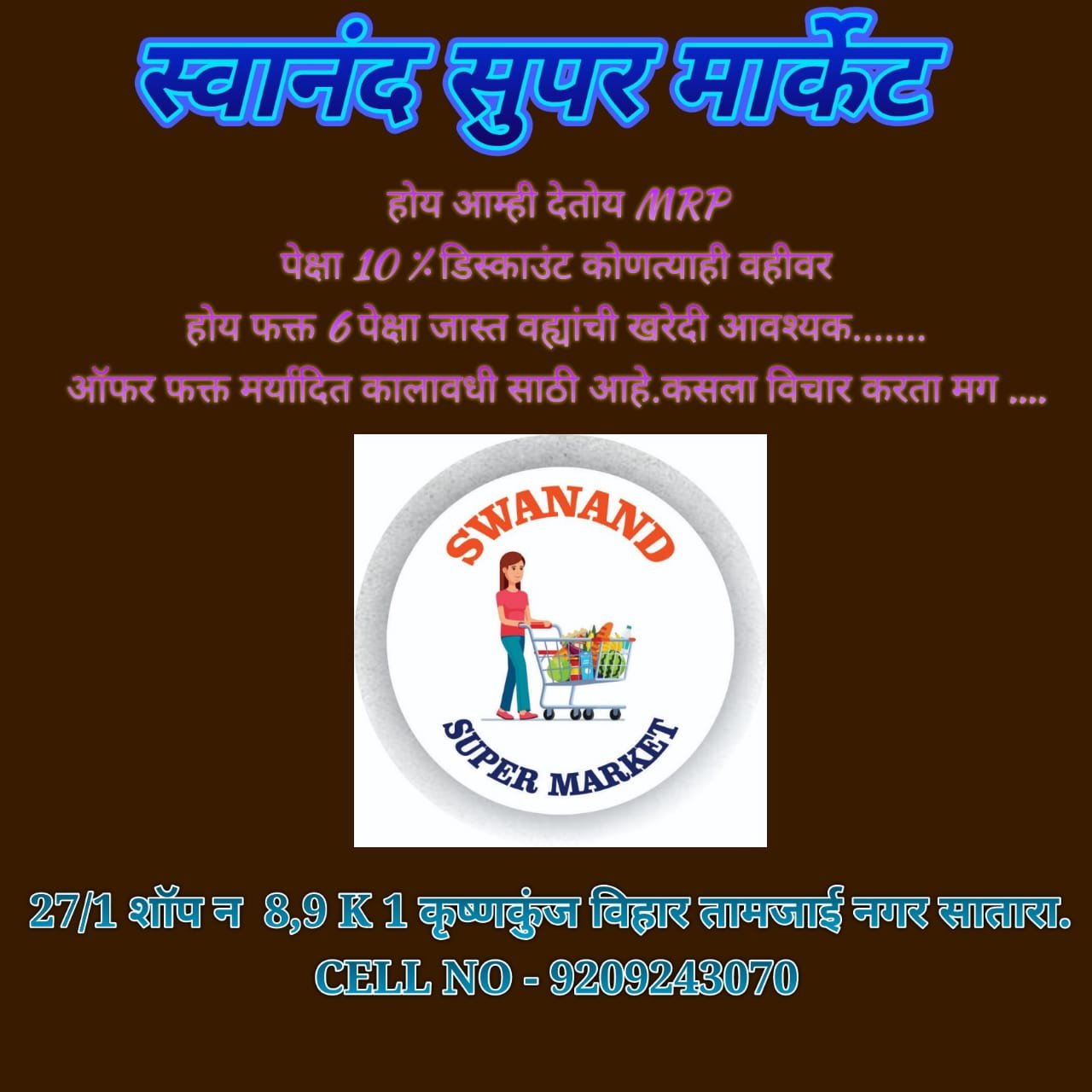 भरपूर व्हरायटी मुबलक प्रमाणात उपलब्ध फॅमिली सह संपूर्ण किराणा खरेदीसाठी एकमेव दालन आपल्या आवडीचे स्वानंद सुपर मार्केट तामजाईनगर,सातारा.