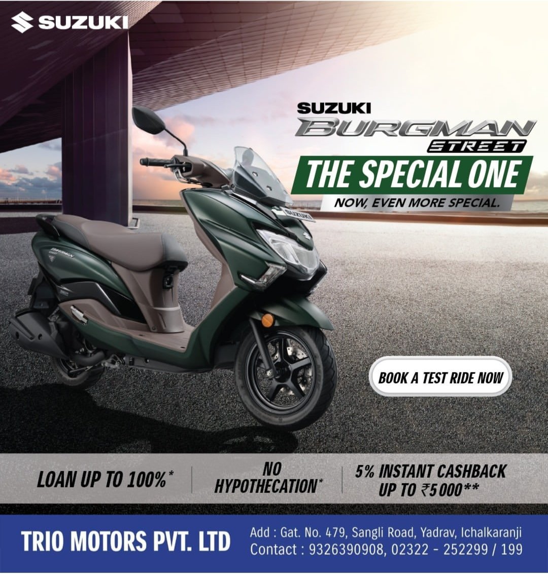 рдЯреНрд░рд╛рдпреЛ рд╕реБрдЭреБрдХреА рдордзреНрдпреЗ рдЖрдкрд▓реЗ рд╕реНрд╡рд╛рдЧрдд рдЖрд╣реЗ...! suzuki bike - 1) рд╕реБрдЭреБрдХреА рдПрдХреНрд╕реЗрд╕ 125 рдордзреАрд▓ рд╕рд░реНрд╡ рдХрд▓рд░ рдЙрдкрд▓рдмреНрдз 2) рд╕реБрдЭреБрдХреА рдЧрд┐рдХреНрд╕рд░ sf рдХрд▓рд░ рд╡ рдореЙрдбреЗрд▓реНрд╕ рдЙрдкрд▓рдмреНрдз. 3) рд╕реБрдЭреБрдХреА burgman street - рдХрд▓рд░ рд╡ рд╕рд░реНрд╡ рдореЙрдбреЗрд▓реНрд╕ рдЙрдкрд▓рдмреНрдз.