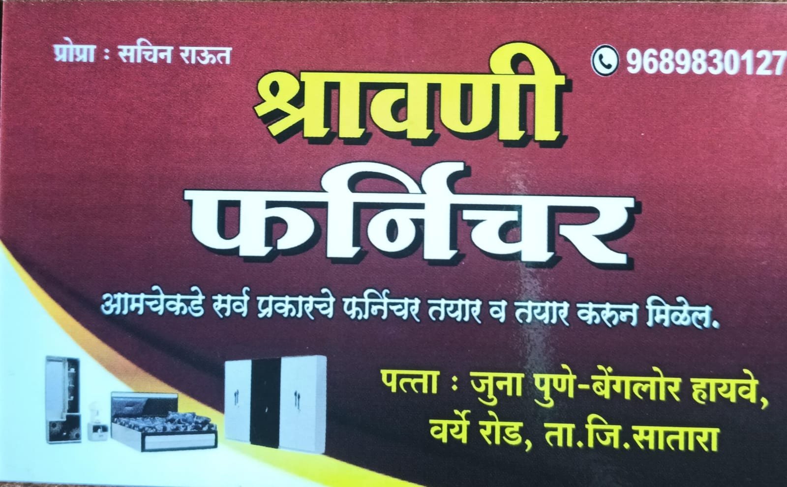 श्रावणी फर्निचर, प्रोप्रा. सचिन राऊत, आमच्याकडे सर्व प्रकारचे फर्निचर तयार व तयार करून मिळेल. जुना पुणे बेंगलोर हायवे, वर्ये रोड तालुका जिल