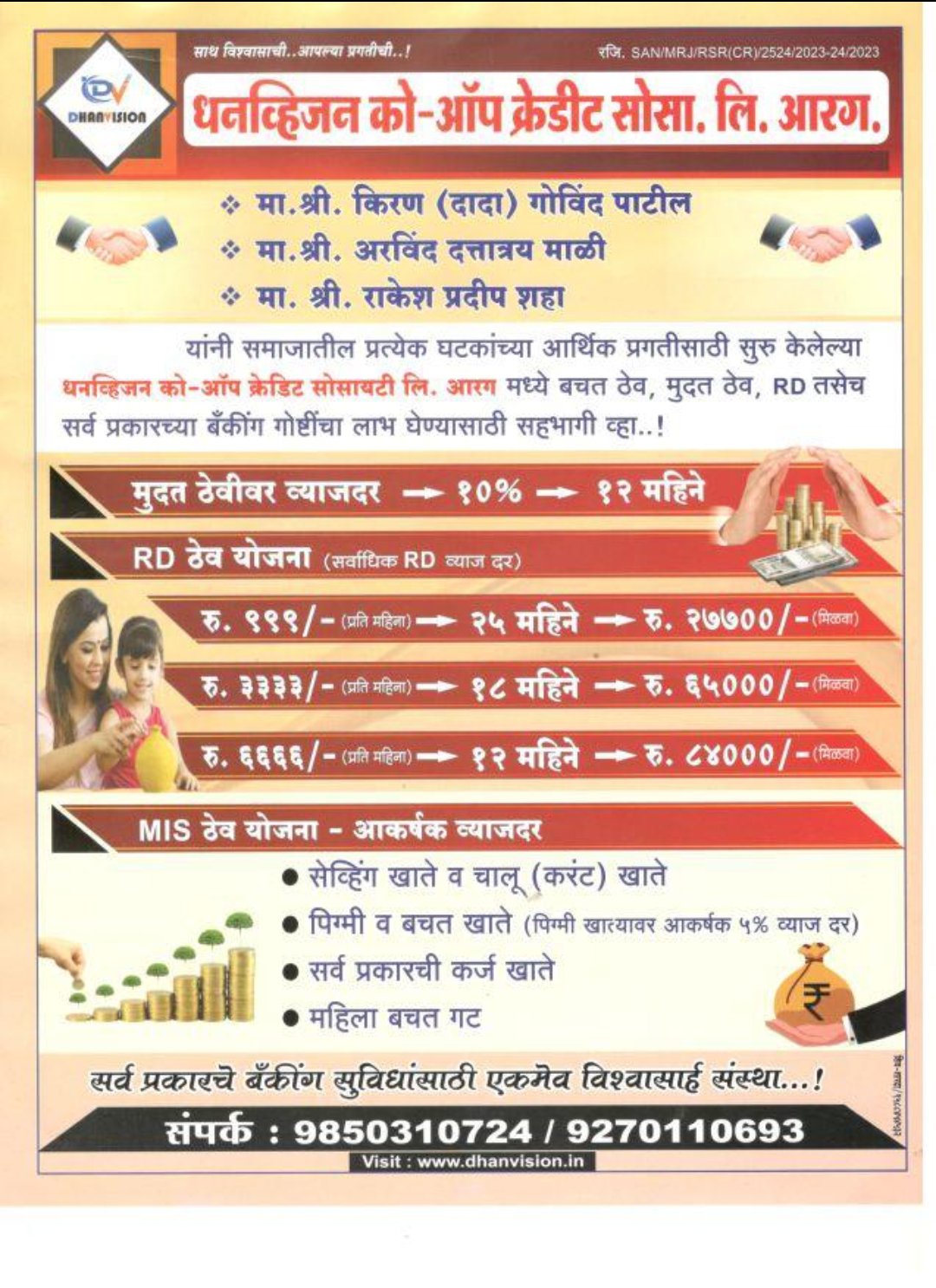 рд╕рд╛рде рд╡рд┐рд╢реНрд╡рд╛рд╕рд╛рдЪреА ..рдЖрдкрд▓реНрдпрд╛ рдкреНрд░рдЧрддреАрдЪреА...! рдорд╛.рд╢реНрд░реА.рдХрд┐рд░рдг (рджрд╛рджрд╛) рдЧреЛрд╡рд┐рдВрдж рдкрд╛рдЯреАрд▓. рдорд╛.рд╢реНрд░реА.рдЕрд░рд╡рд┐рдВрдж рджрддреНрддрд╛рддреНрд░рдп рдорд╛рд│реА. рдорд╛.рд╢реНрд░реА.рд░рд╛рдХреЗрд╢ рдкреНрд░рджреАрдк рд╢рд╣рд╛ ......рд╕рдВрдЪрд▓рд┐рдд...!