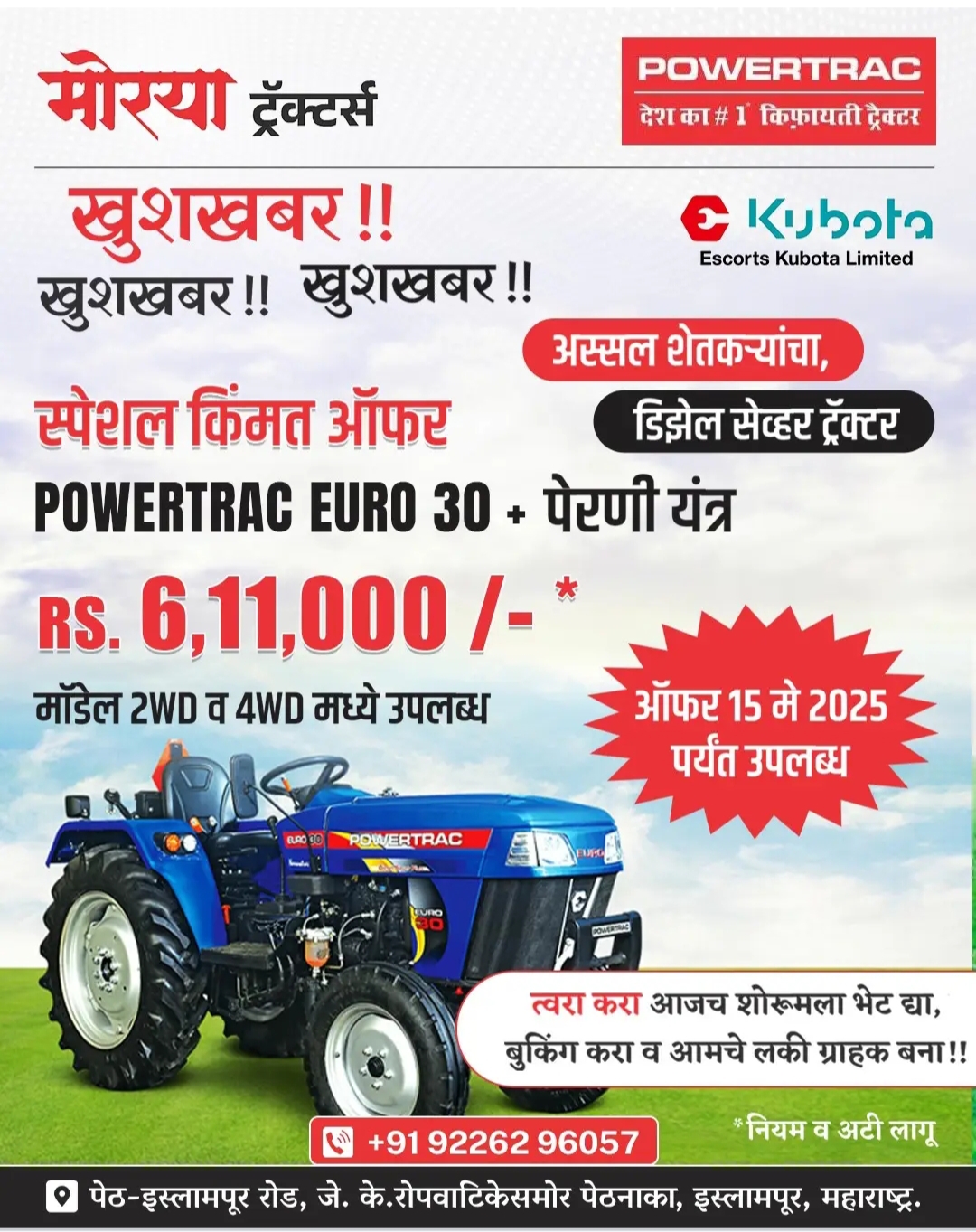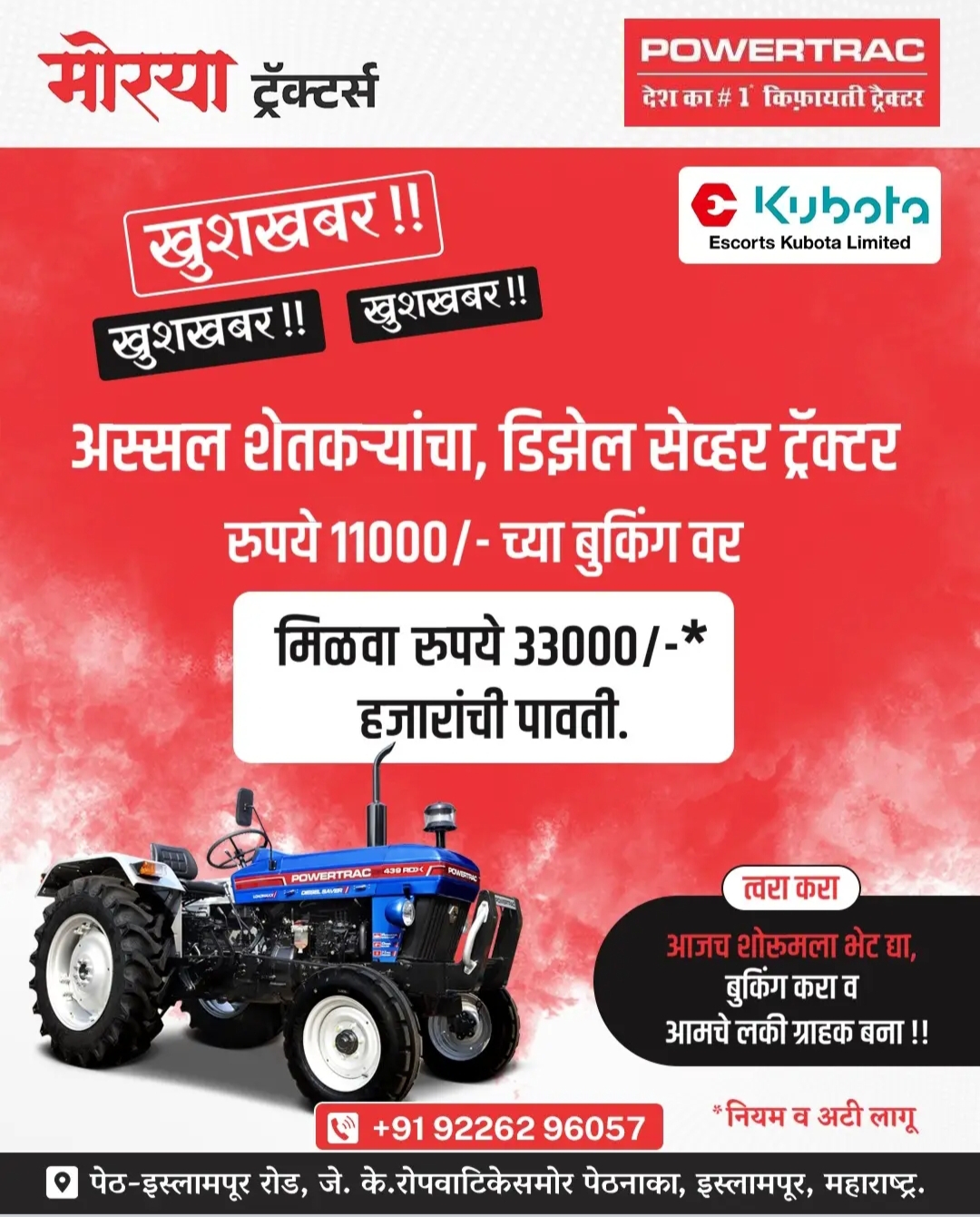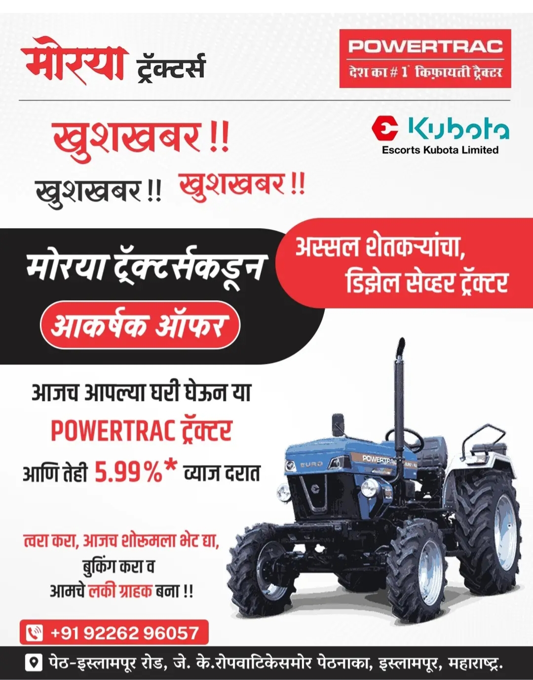 ЁЯТе рдЦреБрд╢рдЦрдмрд░...!рдЦреБрд╢рдЦрдмрд░...! рдЦреБрд╢рдЦрдмрд░ ..!ЁЯТе рдЖрддрд╛ рдЖрдкрд▓реНрдпрд╛ рд╕реНрд╡рдкреНрдирд╛рдВрдЪрд╛ powertrac рдЯреНрд░реЕрдХреНрдЯрд░ рдШреНрдпрд╛ рдЕрд╡рдШреНрдпрд╛ рел.репреп% рдПрд╡рдвреНрдпрд╛ рдХрдореА рд╡реНрдпрд╛рдЬрджрд░рд╛рдд ! ЁЯЪЬрдореЛрд░рдпрд╛ рдЯреНрд░реЗрдХреНрдЯрд░реНрд╕ рдХрдбреВрди рдЖрдХрд░реНрд╖рдХ рдСрдлрд░... рдЕрд╕реНрд╕рд▓ рд╢реЗрддрдХрд▒реНрдпрд╛рдВрдЪрд╛ рдбрд┐рдЭреЗрд▓,рд╕реЗрдХреНрдЯрд░ рдЯреНрд░реЕрдХреНрдЯрд░ - рдлрдХреНрдд powertrac рдордзреНрдпреЗрдЪ...! рдЖрдЬрдЪ рдЖрдкрд▓реНрдпрд╛ рд╢реЛрд░реВрдо рд▓рд╛ рднреЗрдЯ рджреНрдпрд╛ рдмреБрдХрд┐рдВрдЧ рдХрд░рд╛ рдЖрдгрд┐ рдмрдирд╛ рдЖрдордЪреЗ рд▓рдХреА рдЧреНрд░рд╛рд╣рдХ..!
