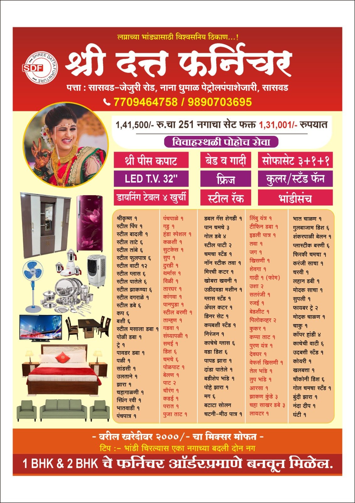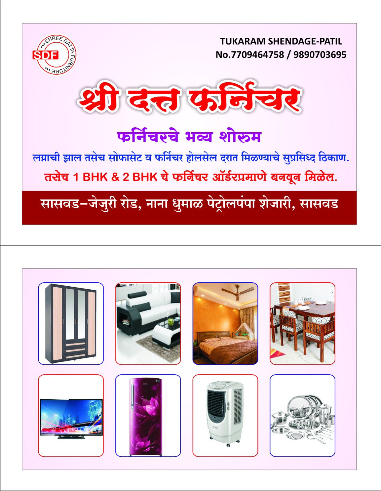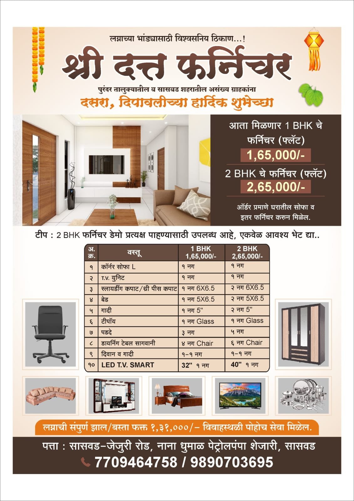 श्री दत्त फर्निचर उच्च दर्जाचे व आधुनिक फर्निचर होलसेल दरात उपलब्ध. लमाची झाल, सोफासेट, डायनिंग टेबल, वॉर्डरोब, किचन सेट, तसेच 1 bhk व 2 bhk चे फर्निचर ऑर्डर प्रमाणे बनवून मिळेल. विश्वासार्ह सेवा आणि दर्जेदार उत्पादने आमची खासियत!