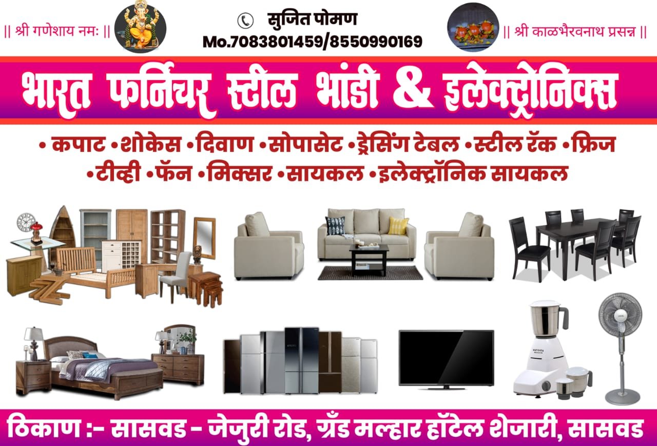 लग्न बस त्याचे माहेरघर. शुभ कार्य तुमचे फर्निचर आमचे. घर बंगलो ऑफिस तसेच इतर सर्व सजावटीसाठी लागणारे सर्व प्रकारचे फर्निचर इलेक्ट्रॉनिक्स प्रॉडक्ट स्टील आणि इतर सर्व साहित्य एका छताखाली मिळण्याचे सासवड शहरातील एकमेव विश्वसनीय ठिकाण.