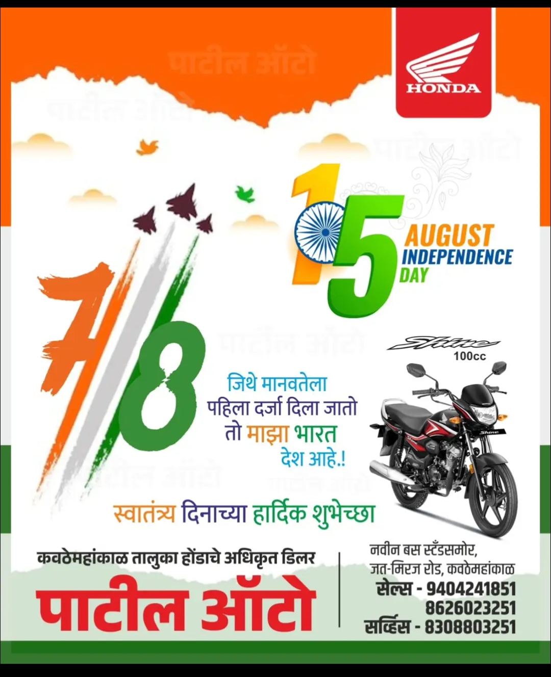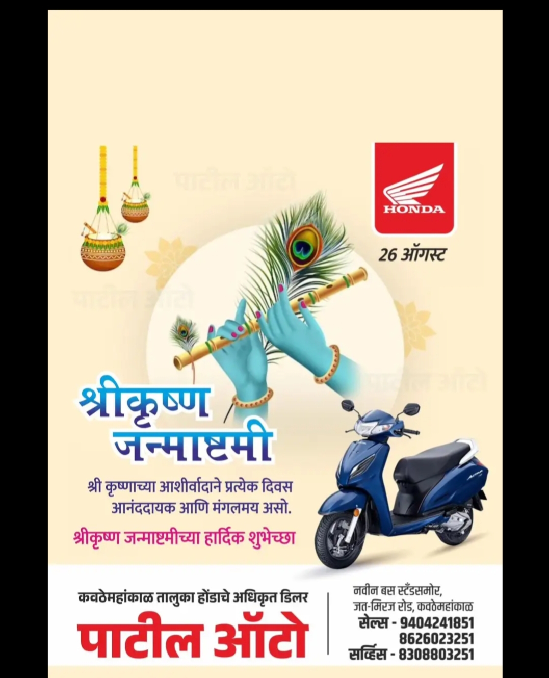 рдкрд╛рдЯреАрд▓ рдСрдЯреЛ рдордзреНрдпреЗ рдЧреНрд░рд╛рд╣рдХрд╛рдВрдЪреЗ рд╕реНрд╡рд╛рдЧрдд рдЖрд╣реЗ . рдЖрдордЪреНрдпрд╛ рдЕрд╕рдВрдЦреНрдп рдЧреНрд░рд╛рд╣рдХрд╛рдВрдирд╛ рдпреЗрдгрд╛рд▒реНрдпрд╛ рд╕рд░реНрд╡ рд╕рдгрд╛рдЪреНрдпрд╛ рд╣рд╛рд░реНрджрд┐рдХ рд╢реБрднреЗрдЪреНрдЫрд╛. .....! рд╣реЛрдВрдбрд╛ рдордзреАрд▓ рд╕рд░реНрд╡ рдореЙрдбреЗрд▓реНрд╕ рдЪреНрдпрд╛ рдмрд╛рдИрдХ, рд╕реЗрд▓реНрд╕ рд╕рд░реНрд╡реНрд╣рд┐рд╕реЗрд╕ рдЕрдБрдб рд╕реНрдкреЗрдЕрд░ рдПрдХрд╛рдЪ рдЫрддрд╛рдЦрд╛рд▓реА рдорд┐рд│рдгреНрдпрд╛рдЪреЗ рдПрдХрдореЗрд╡ рд╡рд┐рд╢реНрд╡рд╛рд╕реВ рдард┐рдХрд╛рдг.