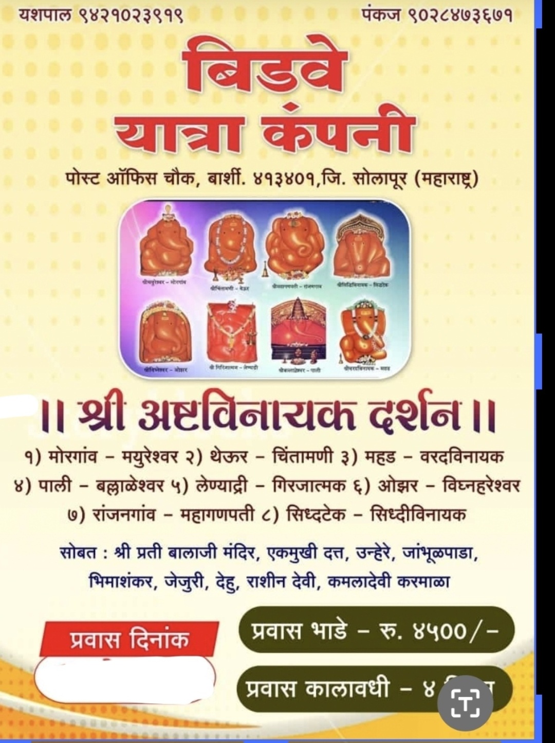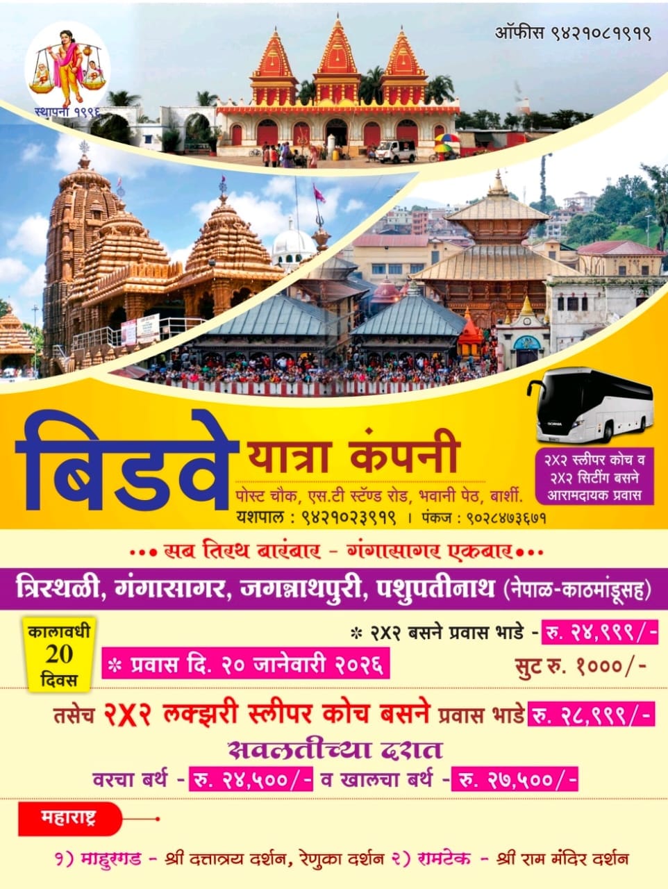 рдСрдлрд┐рд╕ - рдмрд┐рдбрд╡реЗ рдЯреНрд░реЕрд╡реНрд╣рд▓реНрд╕ рднрд╡рд╛рдиреА рдкреЗрда рдПрд╕рдЯреА рд╕реНрдЯрдБрдб рд░реЛрдб.рдмрд╛рд░реНрд╢реА рдпрд╢рдкрд╛рд▓ ЁЯУ▓ 9421023919.9421081919 рдкрдВрдХрдЬ ЁЯУ▓ 9028473671.9420660819