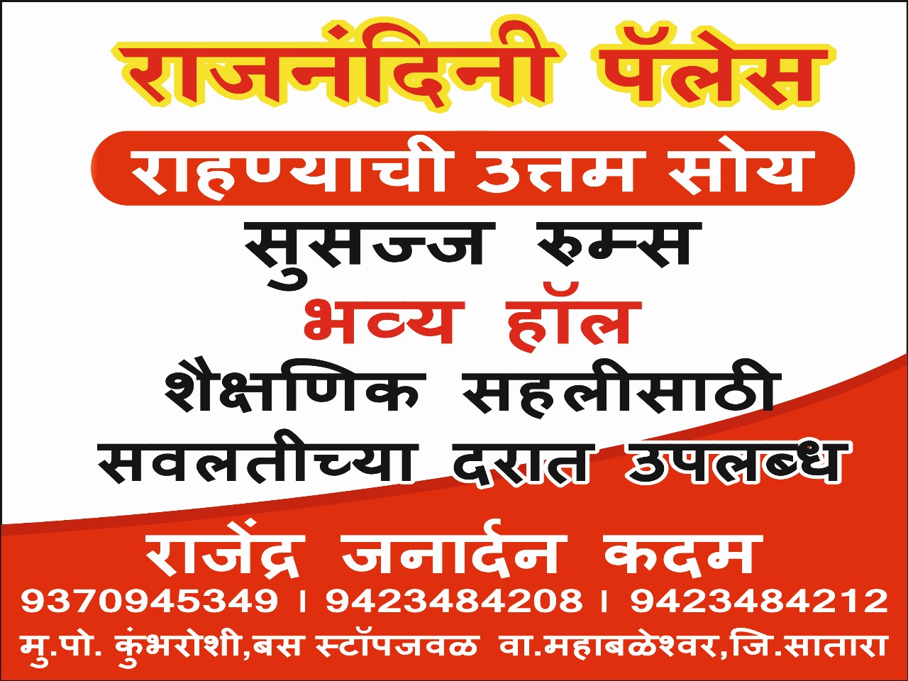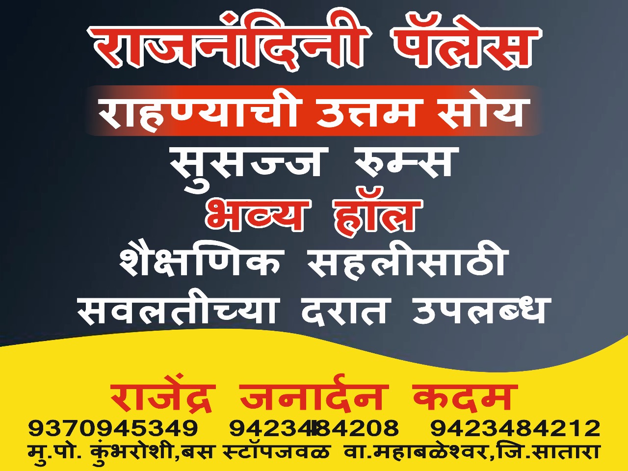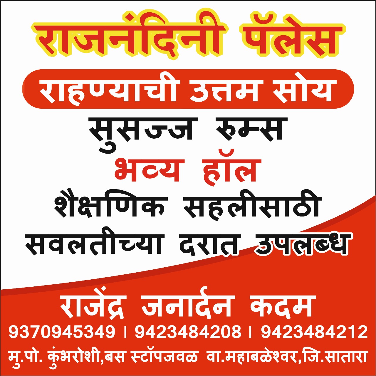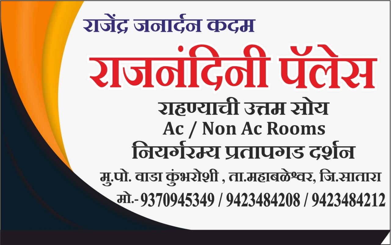 рд░рд╛рдЬ рдирдВрджрд┐рдиреА рдХреЙрдЯреЗрдЬ рд╡ рд╣реЙрдЯреЗрд▓ рд░рд╛рдЬрдирдВрджрд┐рдиреА рдкреЕрд▓реЗрд╕, рддрд╕реЗрдЪ рд╣реЙрдЯреЗрд▓ рдЕрдиреБрд╢реНрд░реА тАФ рдорд╣рд╛рдмрд│реЗрд╢реНрд╡рд░ рдпреЗрдереАрд▓ рд╡рд╛рдбрд╛ рдХреБрдВрднрд░реЛрд╢реА, рд╣рдиреБрдорд╛рди рдордВрджрд┐рд░рд╛рдЬрд╡рд│, рдкреНрд░рддрд╛рдкрдЧрдб рд░реЛрдбрд╡рд░ рд╕реНрдерд┐рдд рдЖрд╣реЗ. рдпреЗрдереЗ рдкреНрд░рд╡рд╛рд╢рд╛рдВрд╕рд╛рдареА рд╕реНрд╡рдЪреНрдЫ, рд╕реБрд░рдХреНрд╖рд┐рдд рд╡ рдЖрд░рд╛рдорджрд╛рдпреА рдирд┐рд╡рд╛рд╕рд╛рдЪреА рддрд╕реЗрдЪ рдЪрд╡рд┐рд╖реНрдЯ рдЖрдгрд┐ рдШрд░рдЧреБрддреА рдЬреЗрд╡рдгрд╛рдЪреА рдЙрддреНрддрдо рд╡реНрдпрд╡рд╕реНрдерд╛ рдХрд░рдгреНрдпрд╛рдд рдЖрд▓реЗрд▓реА рдЖрд╣реЗ. рдлреЕрдорд┐рд▓реА рдЯреНрд░рд┐рдк, рд╕реНрдХреВрд▓ рдЯреНрд░реАрдк рдЖрдгрд┐ рд╕рд╣рд▓реАрдВрд╕рд╛рдареА рд╡рд┐рд╢реЗрд╖ рд╕реБрд╡рд┐рдзрд╛ рд╡ рдпреЛрдЧреНрдп рджрд░рд╛рдд рдмреБрдХрд┐рдВрдЧ рд╕реНрд╡реАрдХрд╛рд░рд▓реЗ рдЬрд╛рддреЗ. рдирд┐рд╕рд░реНрдЧрд░рдореНрдп рд╡рд╛рддрд╛рд╡рд░рдгрд╛рдд рд╢рд╛рдВрдд рд╡ рд╕реБрдЦрдж рдореБрдХреНрдХрд╛рдорд╛рд╕рд╛рдареА рдЖрдордЪреНрдпрд╛рдХрдбреЗ рдЕрд╡рд╢реНрдп рднреЗрдЯ рджреНрдпрд╛. ЁЯМ┐тЬи