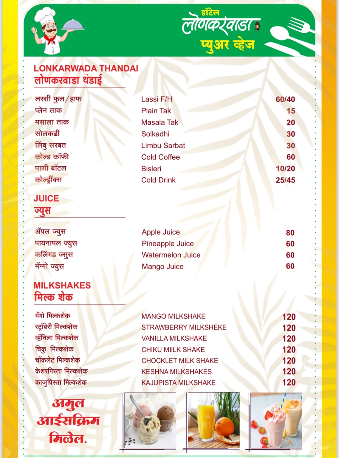 येथे महाराष्ट्रीयन, पंजाबी, साऊथ इंडियन, इंडो-चायनीज अशा अनेक पाककृतींची विस्तृत मेजवानी मिळते. प्रत्येक पदार्थ refined sunflower oil मध्ये स्वच्छतेने तयार केला जातो, ज्यामुळे चव आणि आरोग्य दोन्ही जपले जाते. आधुनिक सजावट, स्वच्छ वातावरण आणि तत्पर सेवा यामुळे लोणकरवाडा हे कुटुंब, मित्रमंडळी किंवा प्रवासादरम्यान जेवणासाठी उत्तम ठिकाण मानले जाते.