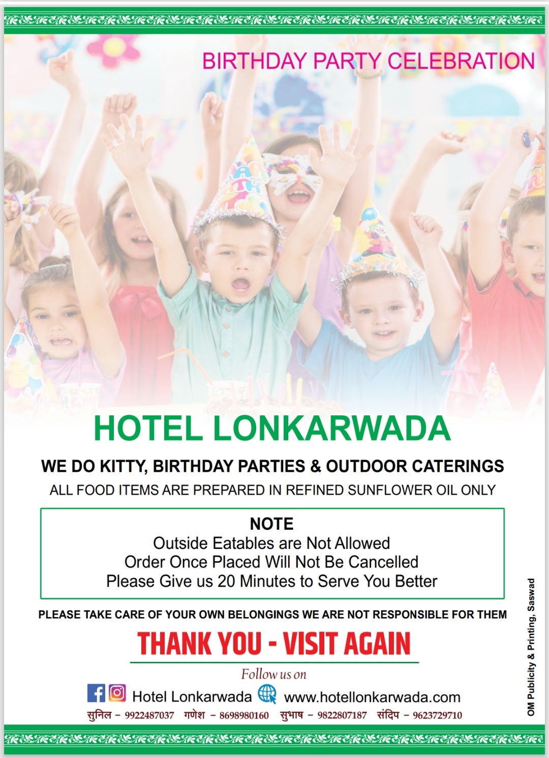 हॉटेल लोणकरवाडा हे उत्कृष्ट चव, स्वच्छता आणि कुटुंबासोबत जेवण्यासाठी आदर्श वातावरण यासाठी विशेष ओळखले जाणारे एकमेव Pure Veg Family Restaurant आहे. येथे महाराष्ट्रीयन, पंजाबी, साऊथ इंडियन, इंडो-चायनीज अशा विविध खाद्यपदार्थांच्या मेजवानीची अनुभूती मिळते.