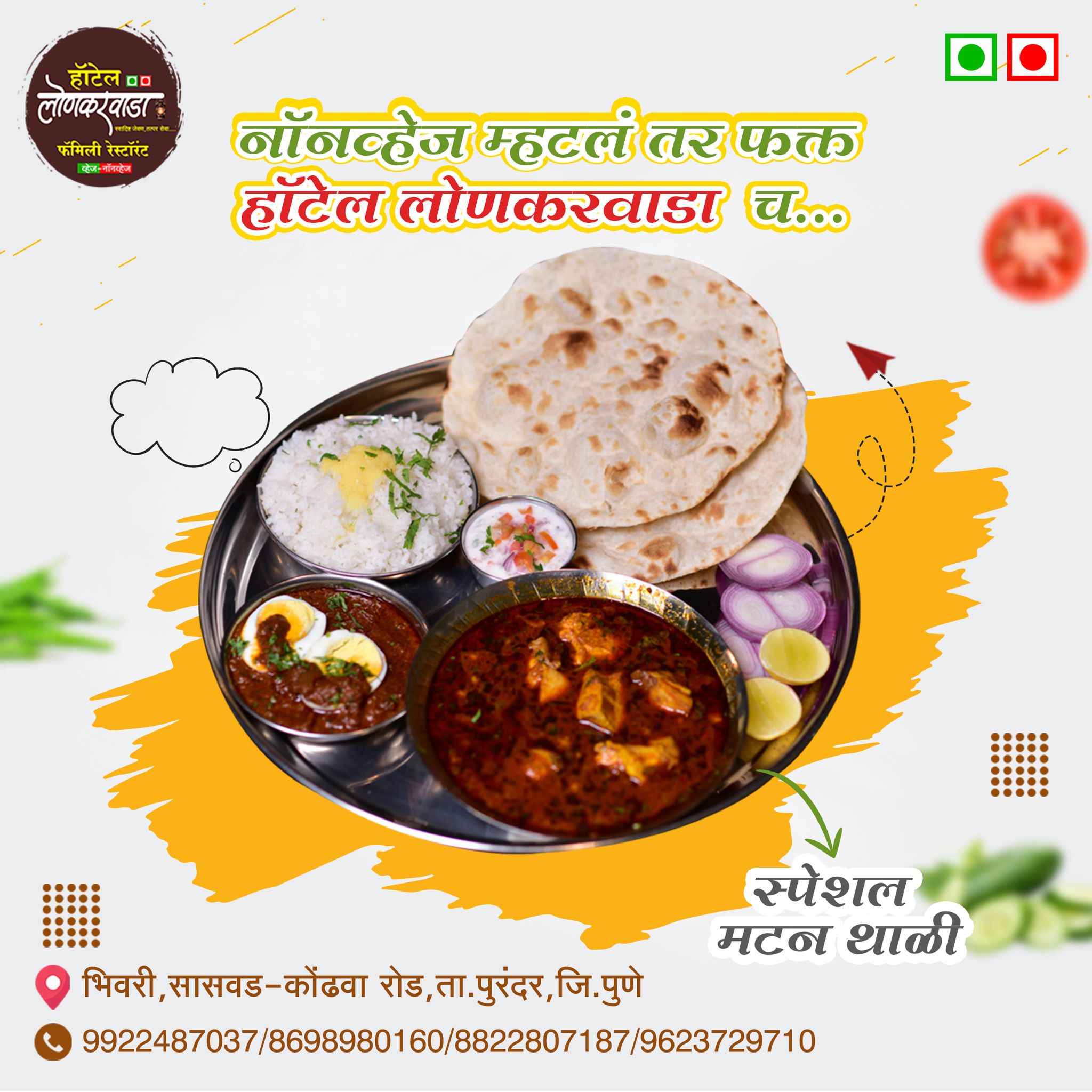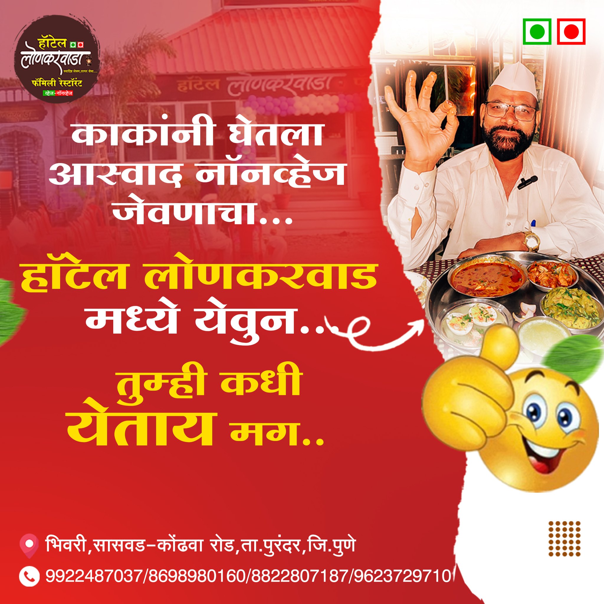 हॉटेल लोणकरवाडा हे भिवरी – सासवड–कोढवा रोडवरील एक लोकप्रिय व्हेज आणि नॉनव्हेज फॅमिली रेस्टॉरंट असून, उत्कृष्ट चव, स्वच्छता आणि ग्राहकाभिमुख सेवेमुळे हे ठिकाण स्थानिक आणि प्रवाशांमध्ये विशेष प्रसिद्ध आहे.