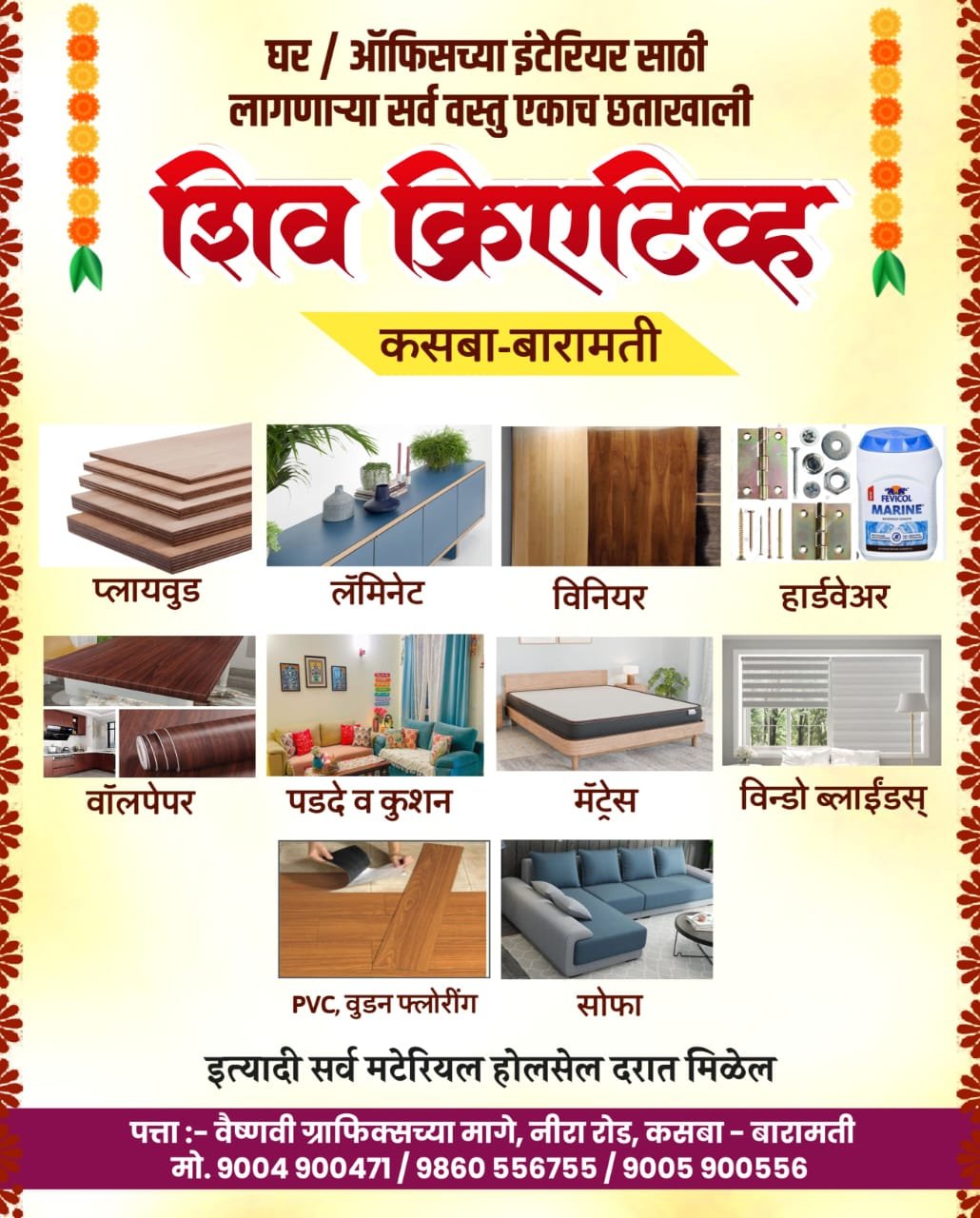 शिव क्रिएटिव्ह फर्निशिंग अँड होम डेकोर.. वैष्णवी ग्राफिक्स च्या मागे, नीरा रोड ,कसबा बारामती...