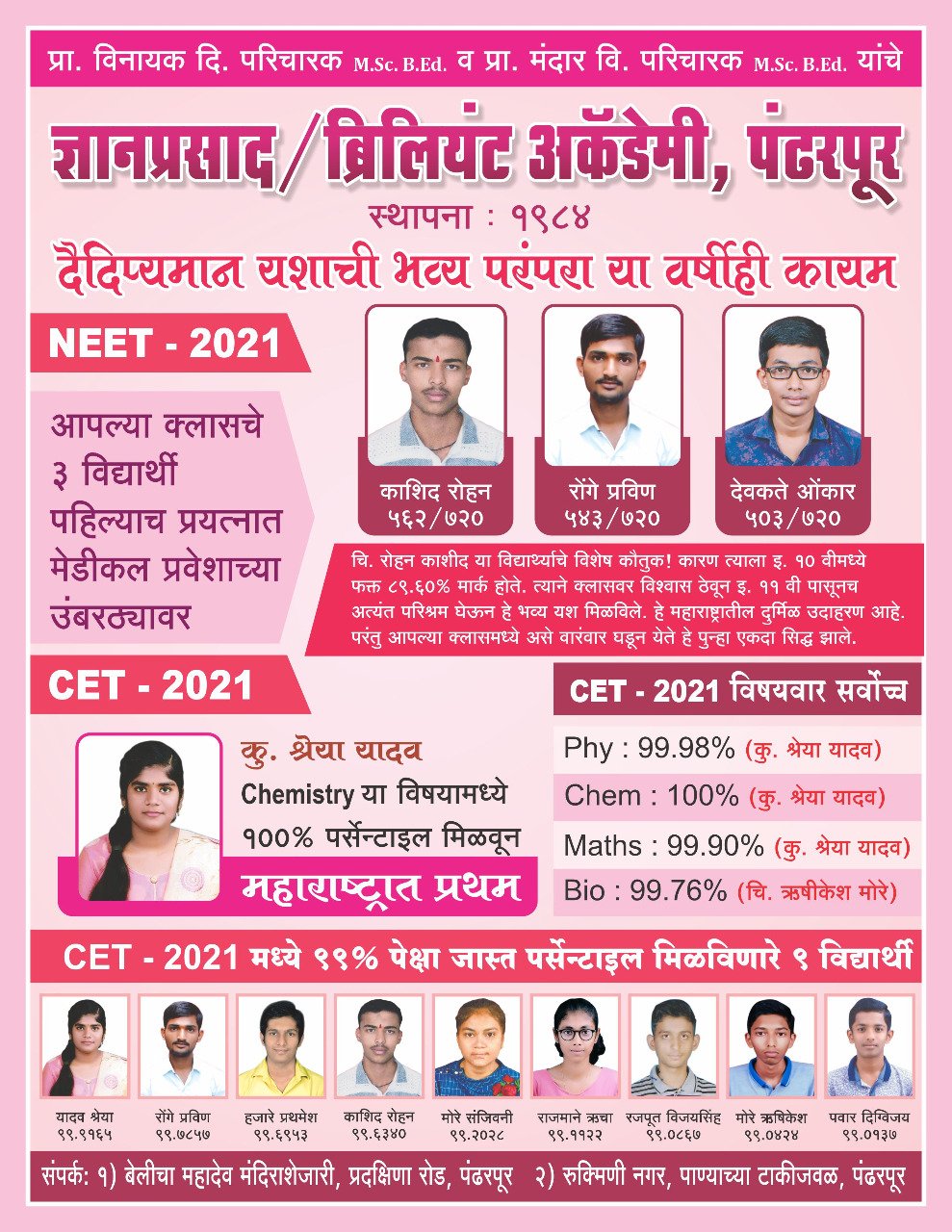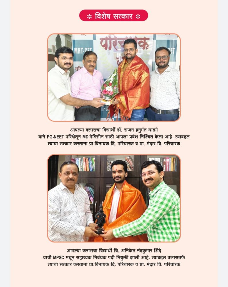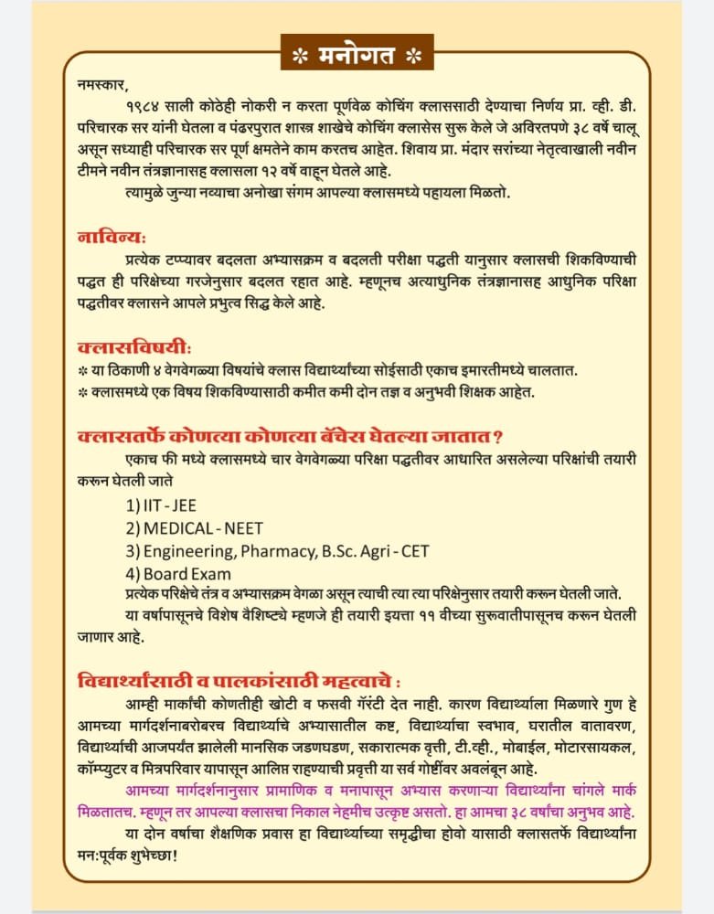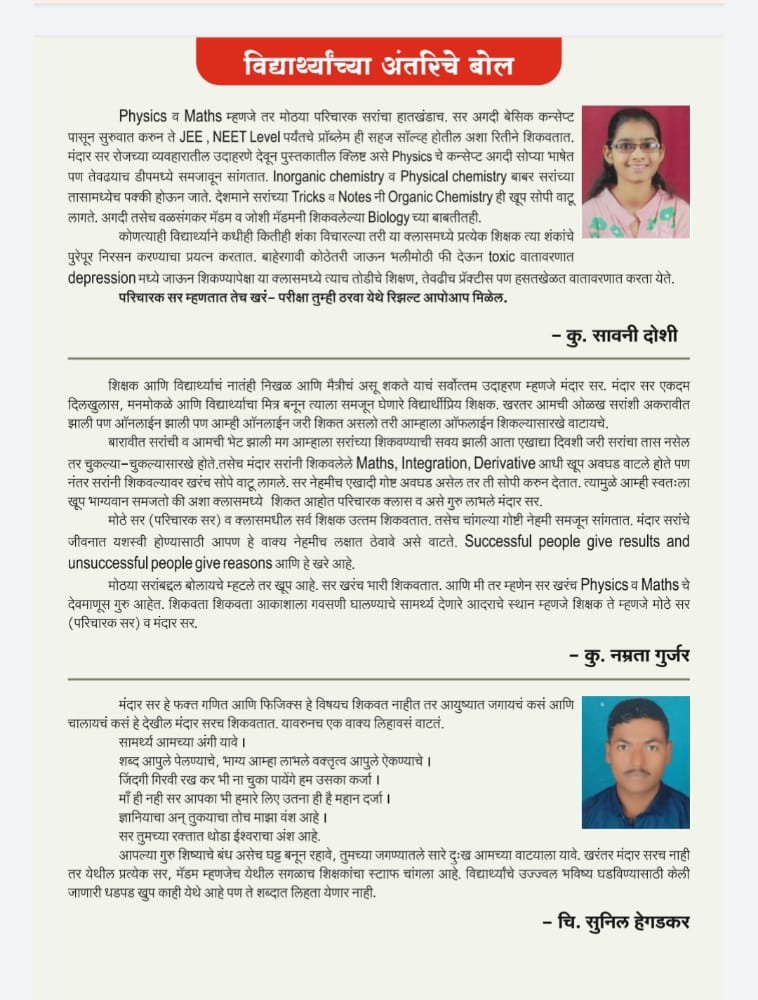 38 वर्षाच्या उज्वल यशाची परंपरा या वर्षीही कायम इ.11 वी पासूनच IIT JEE, MEDICAL NEET, इंजीनियरिंग CET तयारी विद्यार्थ्यांच्या CONCEPT UNDERSTANDING साठी स्मार्ट बोर्ड पेक्षाही ॲडव्हान्स अशा INTERACTIVE PANNEL BOARD द्वारे मार्गदर्शन ENTRANCE परीक्षांची तयारी 11 वी पासूनच OMR SHEET वरती घेतली जाते, अत्याधुनिक ऑटोमॅटिक स्कॅनिंग मशीन वर उत्तरपत्रिका स्कॅन केल्या जातात. या तंत्रज्ञानामुळे विद्यार्थ्यांना Biology या विषयाचे हृदय, मेंदू, मणके,किडनी, Photosynthesis इ. किचकट प्रणाली थ्री डायमेन्शनल तंत्रज्ञानाद्वारे स्वरूपात प्रत्यक्ष पाहता येणार आहेत. CET परीक्षा क्लासच्या स्पेशल ॲप द्वारे सुरूवातीपासून Online पद्धतीने घेतल्या जातात विशेष म्हणजे या वर्षी 11 वी बॅच पासून भारतात उपलब्ध असलेल्या अत्याधुनिक तंत्रज्ञान असलेल्या INTERACTIVE PANNEL बॉर्डर द्वारे गरजेनुसार शिकवले जाणार आहे Physics व Chemistry विषयातील आकृत्या Experimental arrangements इ. गोष्टी थ्री डायमेन्शनल तंत्रज्ञानद्वारे पाहता येणार आहे यामुळे विद्यार्थ्यांच्या सर्व मूलभूत संकल्पना अजून क्लियर होणार आहेत SMS द्वारे पालकांना मार्क कळवले जातात