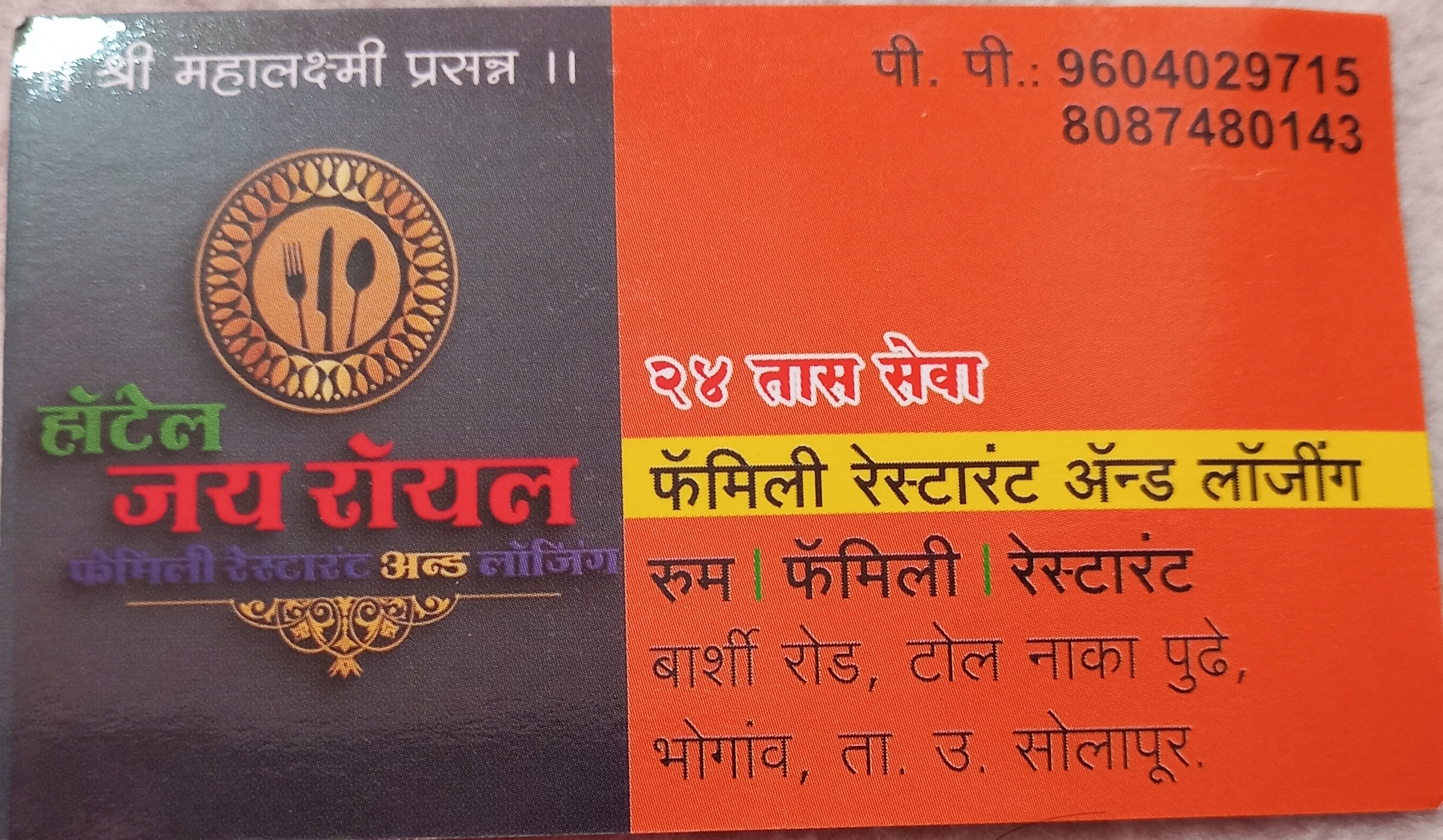 जय रॉयल हॉटेल अँड रेस्टॉरंट, बार्शी रोड, भोगाव टोलनाक्याजवळ, जिल्हा सोलापूर