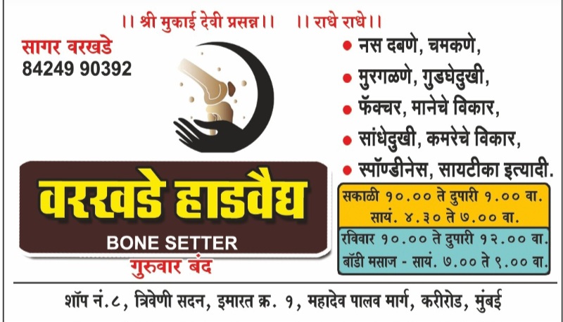 चमकणे, मुरगळणे, फ्रॅक्चर, तसेच मणके बसवणे इत्यादी खात्रीशीर उपचार केले जातील.उपचार- all bone facture फ्रॅक्चर-[facture] मानदुखी -[neck pain] पाठदुखी- [back pain] खांदेदुखी-[shoulder pain] कंबरदुखी- [waist pain ] मसाज-[massage] स्पाॅडीलाइटिस- [spondylitis] खुबा दुखी-[hip joint pain] मणक्याचे विकार -[spine problem] सांधेदुखी-[joint pain] मानदुखी-[cervical pain]