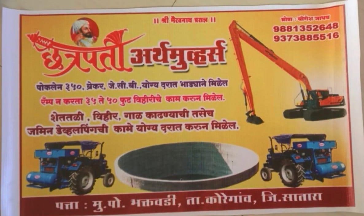 рдЫрддреНрд░рдкрддреА рдЕрд░реНрдердореВрд╡реНрд╣рд░реНрд╕, рдкреНрд░реЛрдкреНрд░рд╛. рдпреЛрдЧреЗрд╢ рдЬрд╛рдзрд╡. рдореБ.рдкреЛ. рднрдХреНрддрд╡рдбреА рддрд╛. рдХреЛрд░реЗрдЧрд╛рд╡ рдЬрд┐. рд╕рд╛рддрд╛рд░рд╛. рдкреЛрдХрд▓реЗрди 350, рдмреЗрдХрд░реНрд╕ , рдЬреЗ рд╕реА рдмреА рдпреЛрдЧреНрдп рджрд░рд╛рдд рднрд╛рдбреНрдпрд╛рдиреЗ рдорд┐рд│реЗрд▓. рд░реЕрдореНрдк рди рдХрд░рддрд╛ 30 рддреЗ 60 рдлреВрдЯ рд╡рд┐рд╣реАрд░ рдХрд╛рдо рдХрд░реВрди рдорд┐рд│реЗрд▓. рд╢реЗрддрддрд│реЗ рд╡рд┐рд╣реАрд░ рдЧрд╛рд│ рдХрд╛рдврдгреНрдпрд╛рдЪреЗ рддрд╕реЗрдЪ рдЬрдореАрди рдбреЗрд╡реНрд╣рд▓рдкрд┐рдВрдЧрдЪреА рдХрд╛рдореЗ рдпреЛрдЧреНрдп рджрд░рд╛рдд рдХрд░реВрди рдорд┐рд│рддреАрд▓. рддрд╕реЗрдЪ, рддрд╛рд╕рд╛рд╡рд░рддреА рд╡ рдХреЙрдиреНрдЯреНрд░реЕрдХреНрдЯ рдмреЗрд╕ рд╡рд░рддреА рдХрд╛рдореЗ рдХрд░реВрди рдорд┐рд│рддреАрд▓.