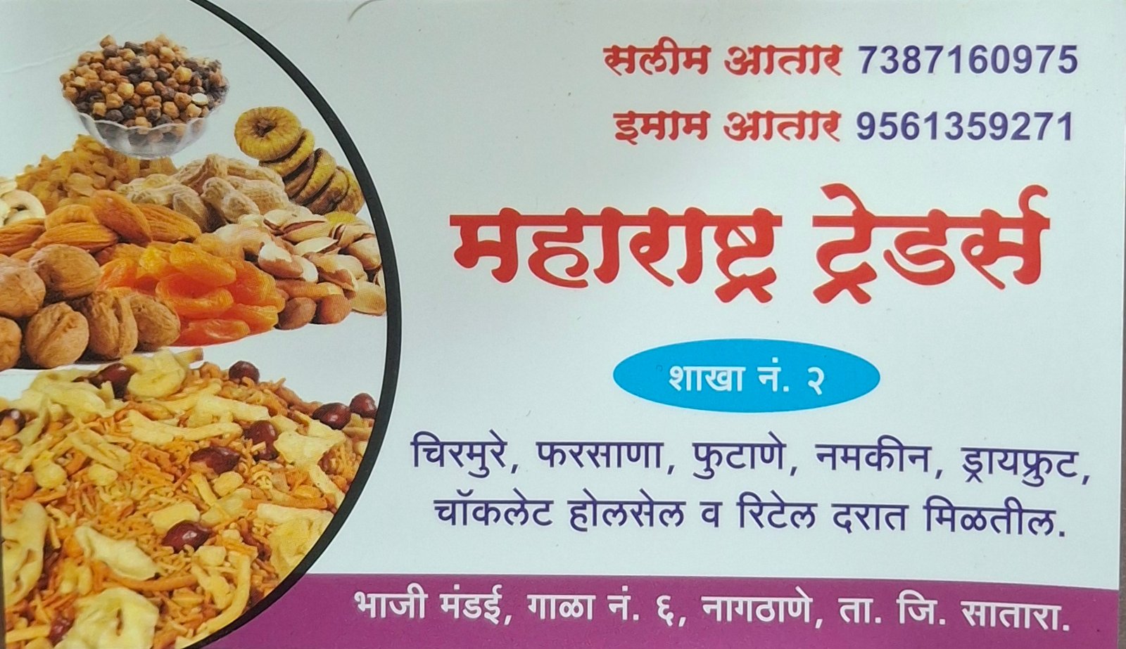 🍹🍬🍫 स्वच्छ व निवडक चविष्ट पदार्थ 🍹🍬🍫15 वर्षेची अविरत विश्वसनीय परंपरा. 🍹🍬🍫 सर्व कंपनी चे चॉकलेट, फरसाणा होलसेल दरात उपलब्ध. 🍹🍬🍫 छोटया व्यपाऱ्यांना दुकान पोहोच सर्विस 🍹🍬🍫 योग्य व मापक दर. 🍹🍬🍫सर्व प्रकारचे बिस्कीट, नानकटाई, तसेच बटर उपलब्ध. 🍹🍬🍫 एक वेळ अवश्य भेट द्या. 🍹🍬🍫 महाराष्ट्र ट्रेडर्स ला भेट अथवा संपर्क केल्याबद्दल धन्यवाद.