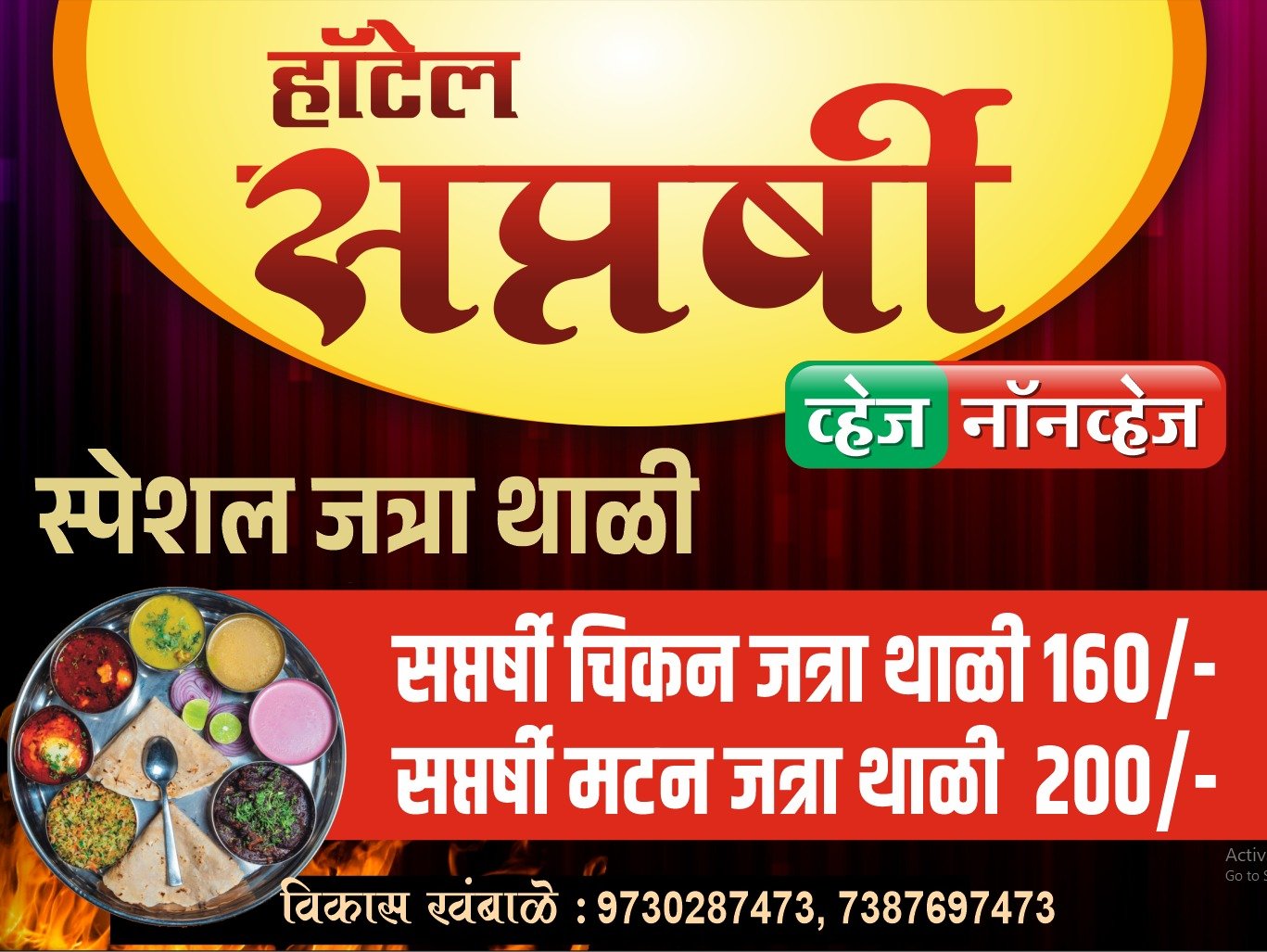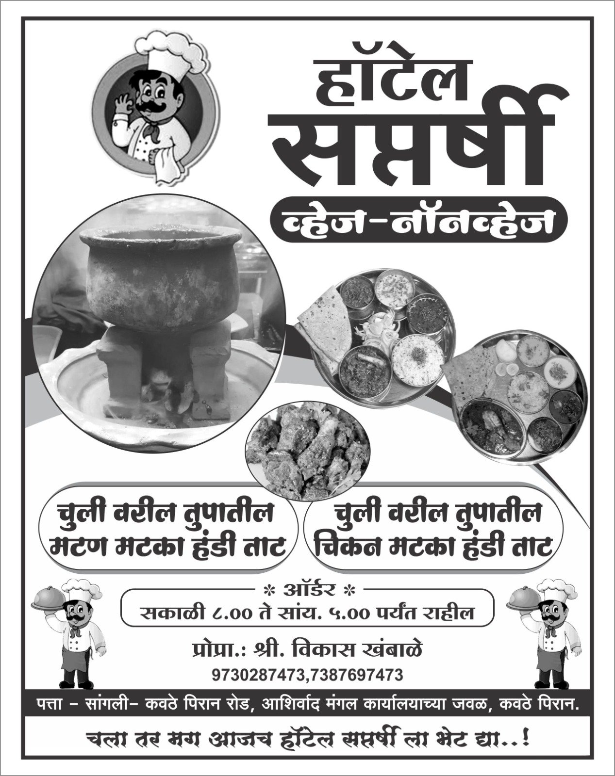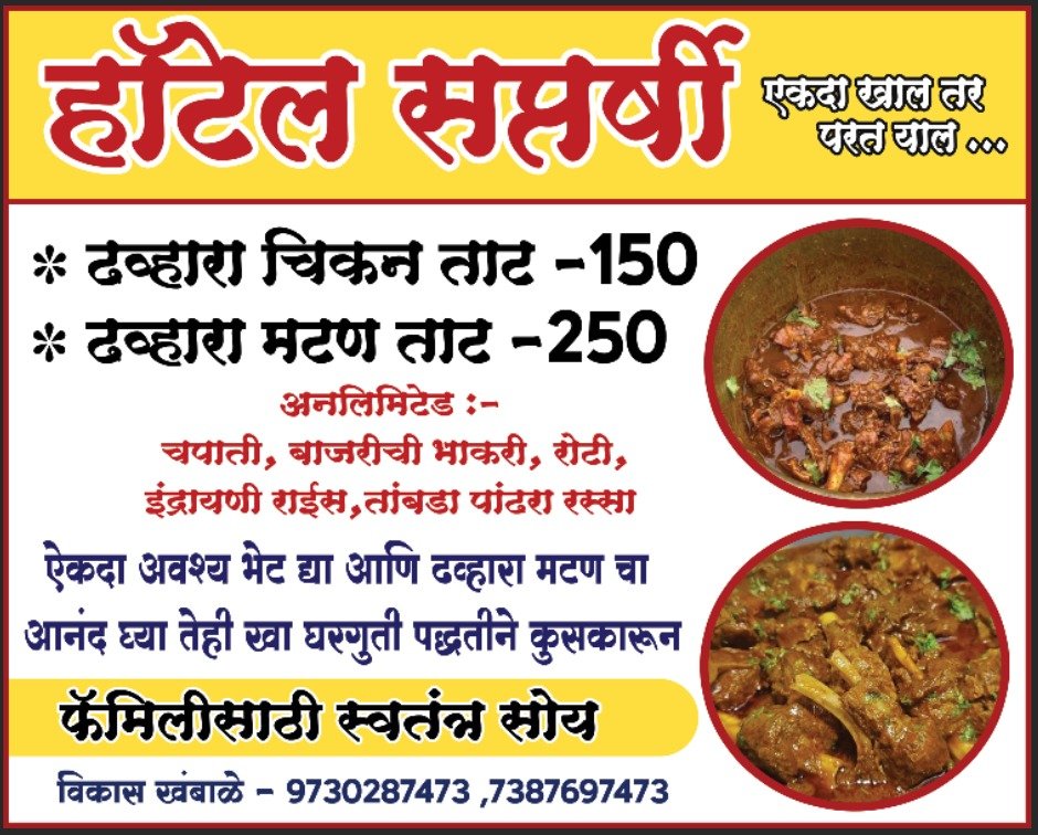 рд╣реЙрдЯреЗрд▓ рд╕рдкреНрддрд░реНрд╖реА рдорд╛рдВрд╕рд╛рд╣рд╛рд░реА рд╕реНрдкреЗрд╢рд▓ рдордзреНрдпреЗ :- рддреБрдкрд╛рддреАрд▓ рдордЯрдг -рддреБрдкрд╛рддреАрд▓ рдЪрд┐рдХрди, рд╕реНрдкреЗрд╢рд▓ рдврд╡рд╛рд░рд╛ рдЪрд┐рдХрди рдордЯрдг рддрд╛рдЯ ,рд╕реНрдкреЗрд╢рд▓ рдордЯрдХрд╛ рд╣рдВрдбреА ,рдЕрдВрдбрд╛ рддрд╛рдЯ рдШрд░рдШреБрддреА рдкрджреНрдзрддреАрдЪреНрдпрд╛ рд░рд╕реНрд╕рд╛ рдЪрд╛ рдЖрдирдВрдж рдШреЗрдгреНрдпрд╛рд╕рд╛рдареА.... рдЖрдЬрдЪ рдлреЗрдорд┐рд▓реА рд╕рд╣рд┐рдд рднреЗрдЯ рдШреНрдпрд╛ рдЖрдордЪреНрдпрд╛рдХрдбреЗ рдЙрдХреНрддреГрд╖реНрдЯ рд╢рд╛рдХрд╛рд╣рд╛рд░реА рдордзреНрдпреЗ:- рдХрд╛рдЬреВ рдорд╕рд╛рд▓рд╛ рддрд╛рдЯ, рдкрдиреАрд░ рдорд╕рд╛рд▓рд╛ рддрд╛рдЯ, рдХрд╛рдЬреВ рдкрдиреАрд░ , рдХрд╛рдЬреВ рдкрдиреАрд░ рдорд┐рдХреНрд╕ рддрд╛рдЯ рдорд┐рд│реЗрд▓.