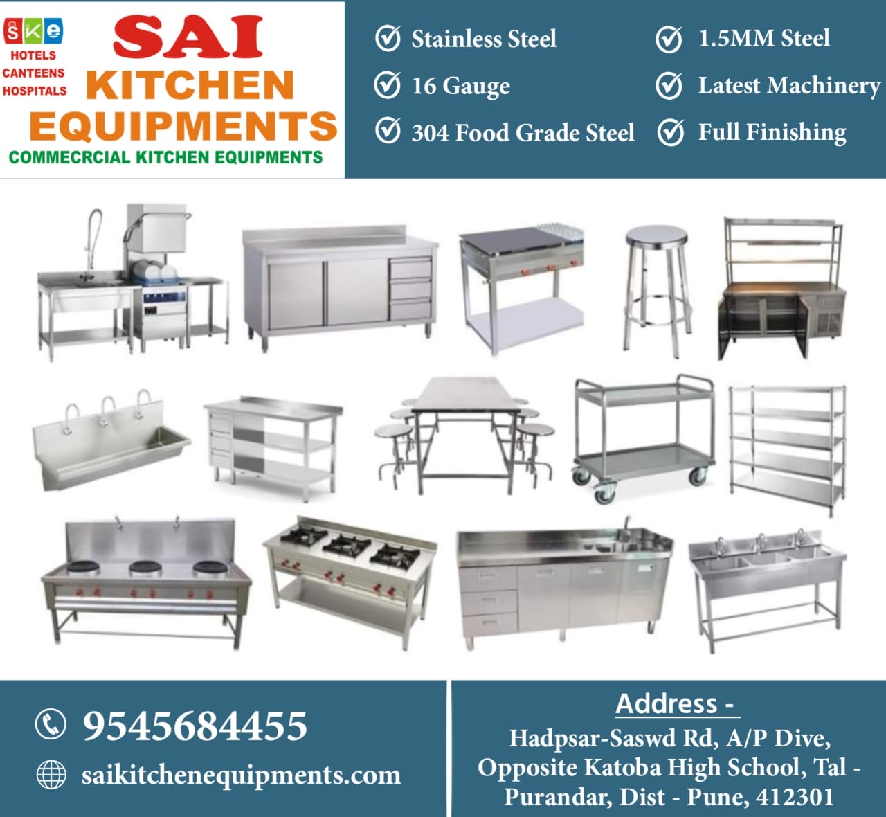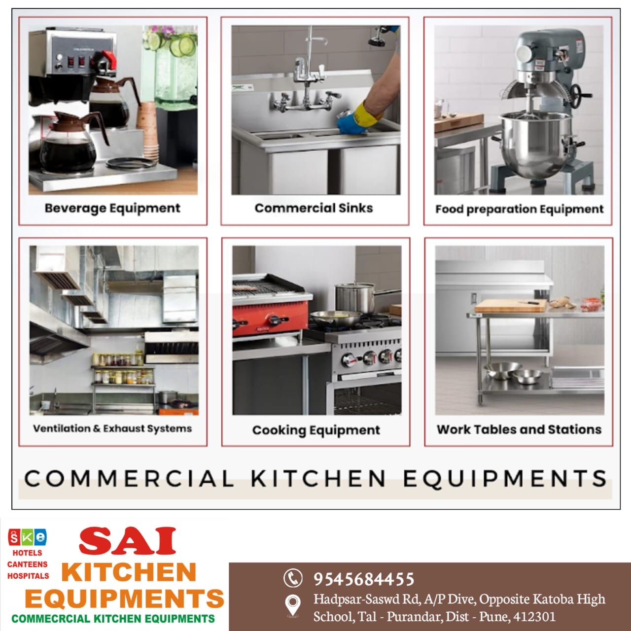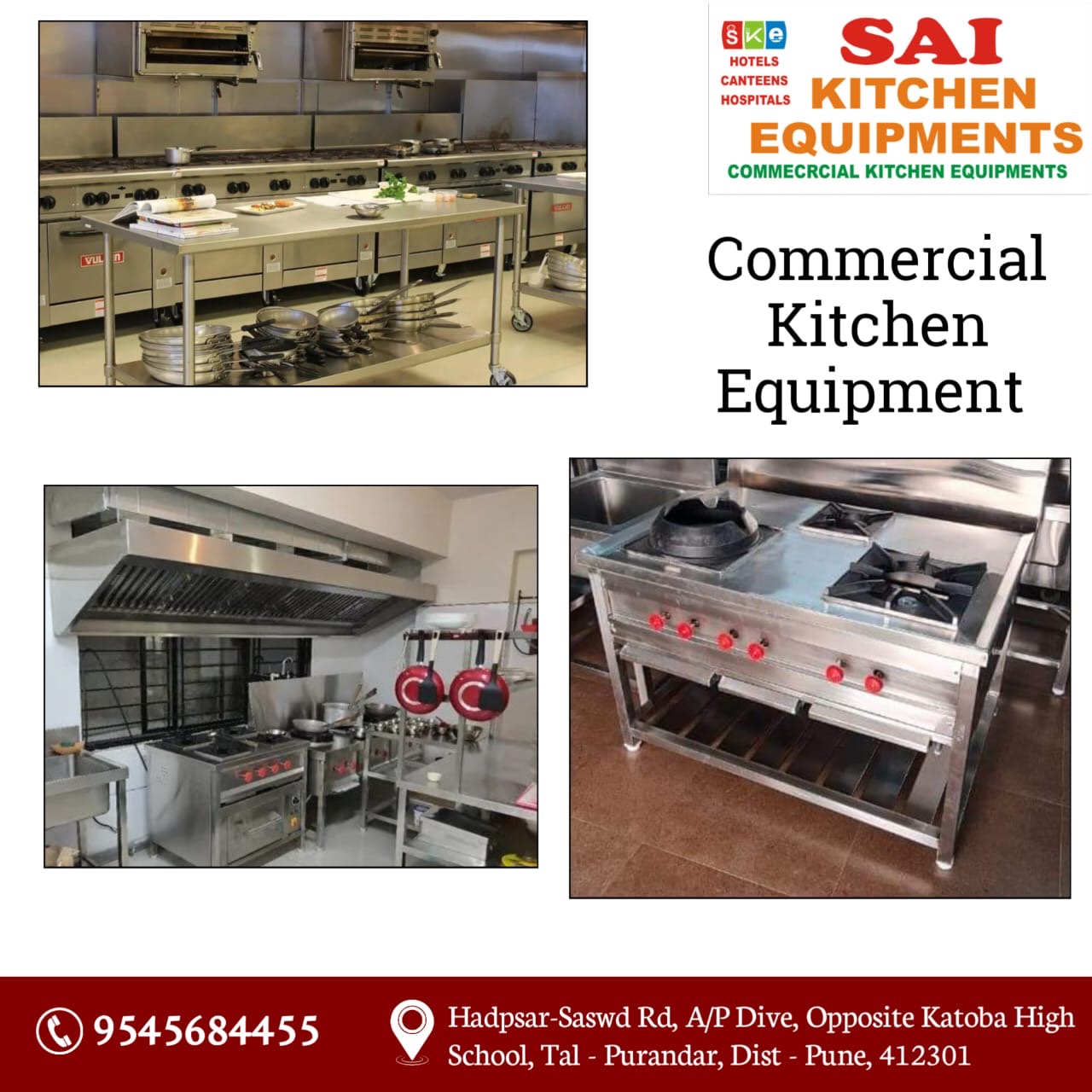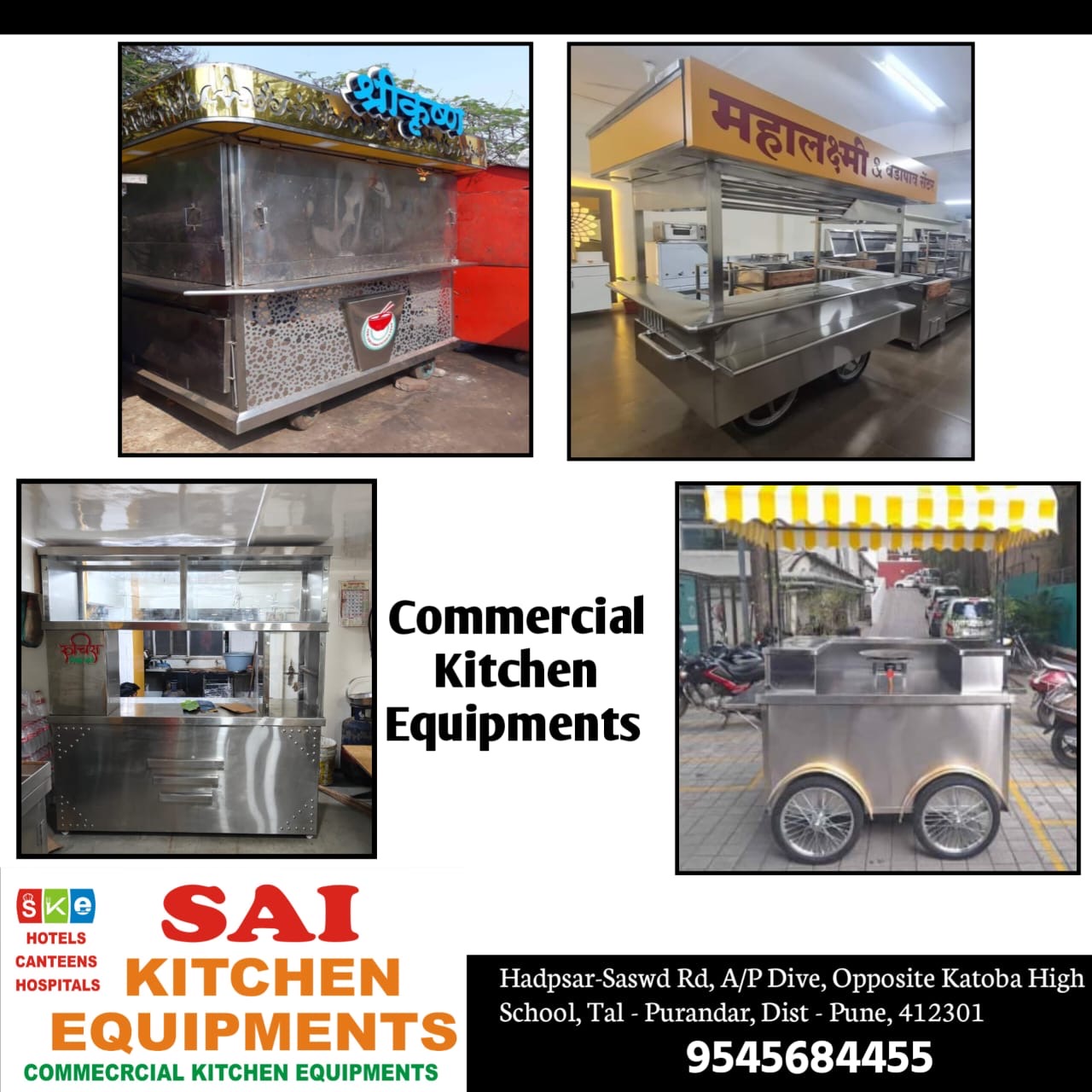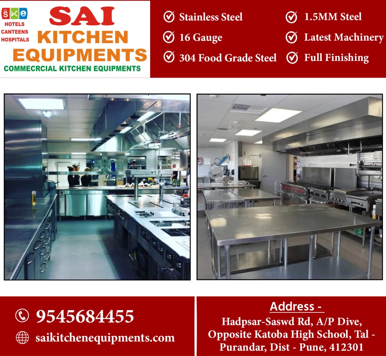 साई कमर्शियल किचन इक्विपमेंट्स & रेफ्रिजरेशन येथे हॉटेल, कॅन्टीन, रेस्टॉरंट आणि हॉस्पिटल साठी लागणारे सर्व प्रकारचे एस एस किचन इक्विपमेंट, कोल्ड रूम, इम्पोर्टेड इक्विपमेंट, एक्झॉस्ट व डक्टिंग सिस्टीम उपलब्ध आहेत. उत्तम क्वालिटी, टिकाऊपणा, योग्य किंमत आणि वेळेवर सेवा हा आमचा मुख्य उद्देश. नवीन किचन सेटअपपासून सर्व्हिसिंगपर्यंत सर्व सुविधा एकाच ठिकाणी!