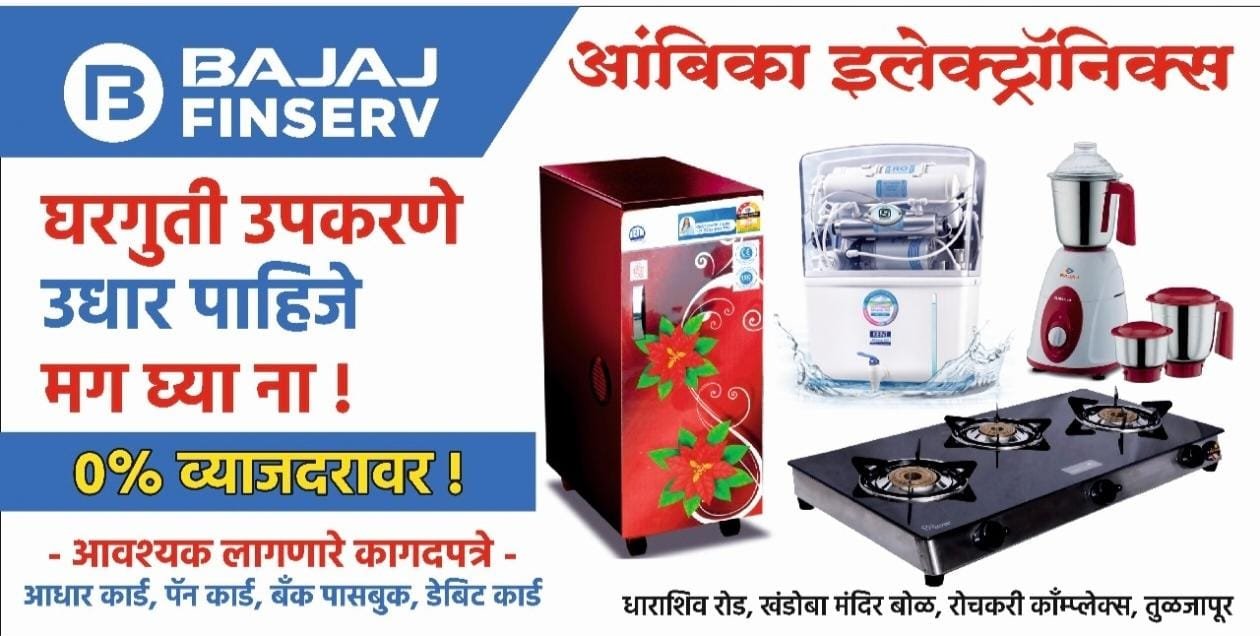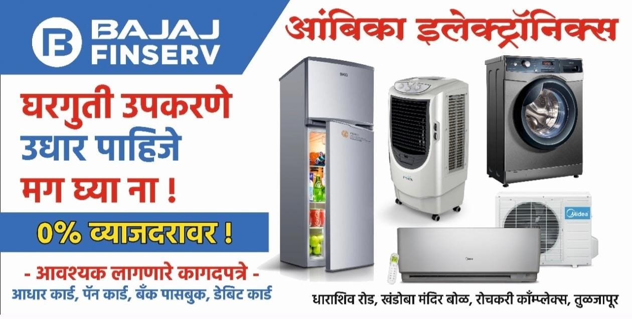 इलेक्ट्रॉनिक्स क्षेत्रातील तुळजापूर मधील खात्रीशीर ठिकाण म्हणजेच न्यू अंबिका इलेक्ट्रॉनिक्स. आमच्या कडे सर्व प्रकारच्या इलेक्ट्रॉनिक्स वस्तू ब्रांडेड कंपनीच्या खात्रीशीर योग्य व मापक दरात उपलब्ध आहेत. फ्रिज, वॉशिंग मशीन यांची विक्री व दुरुस्ती उपलब्ध आहे. घरपोच सेवा.