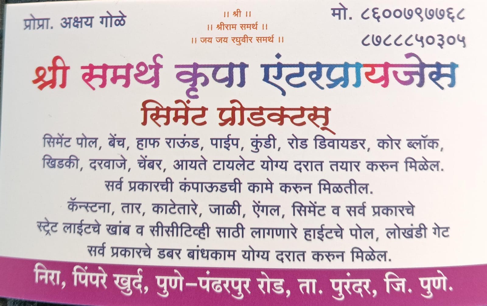 श्री समर्थ कृपा इंटरप्राईजेस ही सिमेंट प्रॉडक्ट्स व बांधकाम क्षेत्रातील विश्वासार्ह संस्था आहे. येथे सिमेंट पोल, पाईप, बेंच, कुंडी, रोड डिव्हायडर, कोर ब्लॉक, रेडीमेड टॉयलेट तसेच कंपाउंड व डबर बांधकामाची सर्व कामे योग्य दरात करून मिळतात. दर्जेदार साहित्य, वेळेवर काम पूर्ण करण्याची हमी आणि ग्राहकांचा विश्वास ही आमची ओळख आहे.