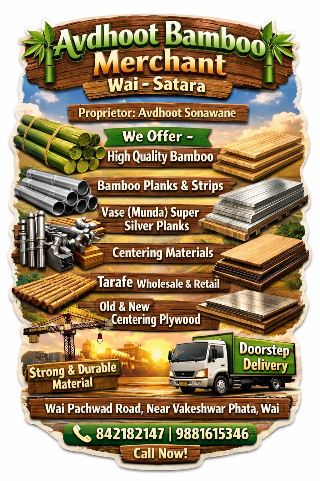 आमच्याकडे बांबू,बांबू फळी, वासे (मुंडा ) सुपर सिल्वर फळी व पट्टी तसेच सेंटरिंग मटेरियल, तराफे होलसेल व रिटेल दारात मिळतील.
