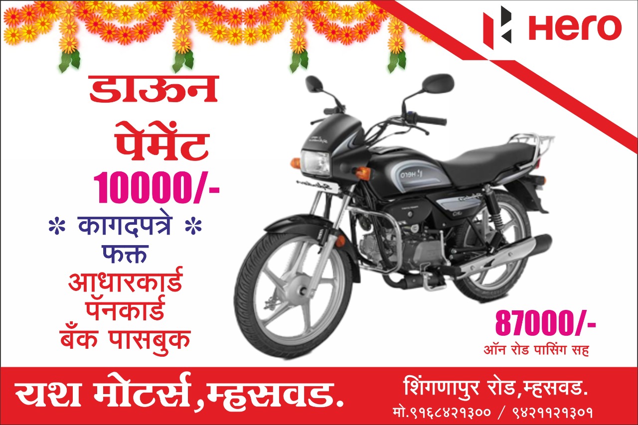 २०००/- भरा व घरी आणा आपली एच एफ डीलक्स बटन स्टार्ट १००००/-भरा वगैरे आणा आपली स्प्लेंडर प्लस कोणत्याही बँकेचे चेकची आवश्यकता नाही विना चेक फक्त आधार कार्ड पॅन कार्ड व नॅशनल बँकेचे बँक पासबुक १००००/-एक्स्ट्रीम गाडीवरती रोख डिस्काउंट विनम्र आणि तत्पर सेवा टू व्हीलर चे सर्व स्पेअर्स उपलब्ध आहेत हिरो टू व्हीलर सर्व कलर मध्ये स्टॉक उपलब्ध आहे हिरो टुविलर चे सर्व मॉडेल्स उपलब्ध आहेत त्वरित संपर्क करा धन्यवा�